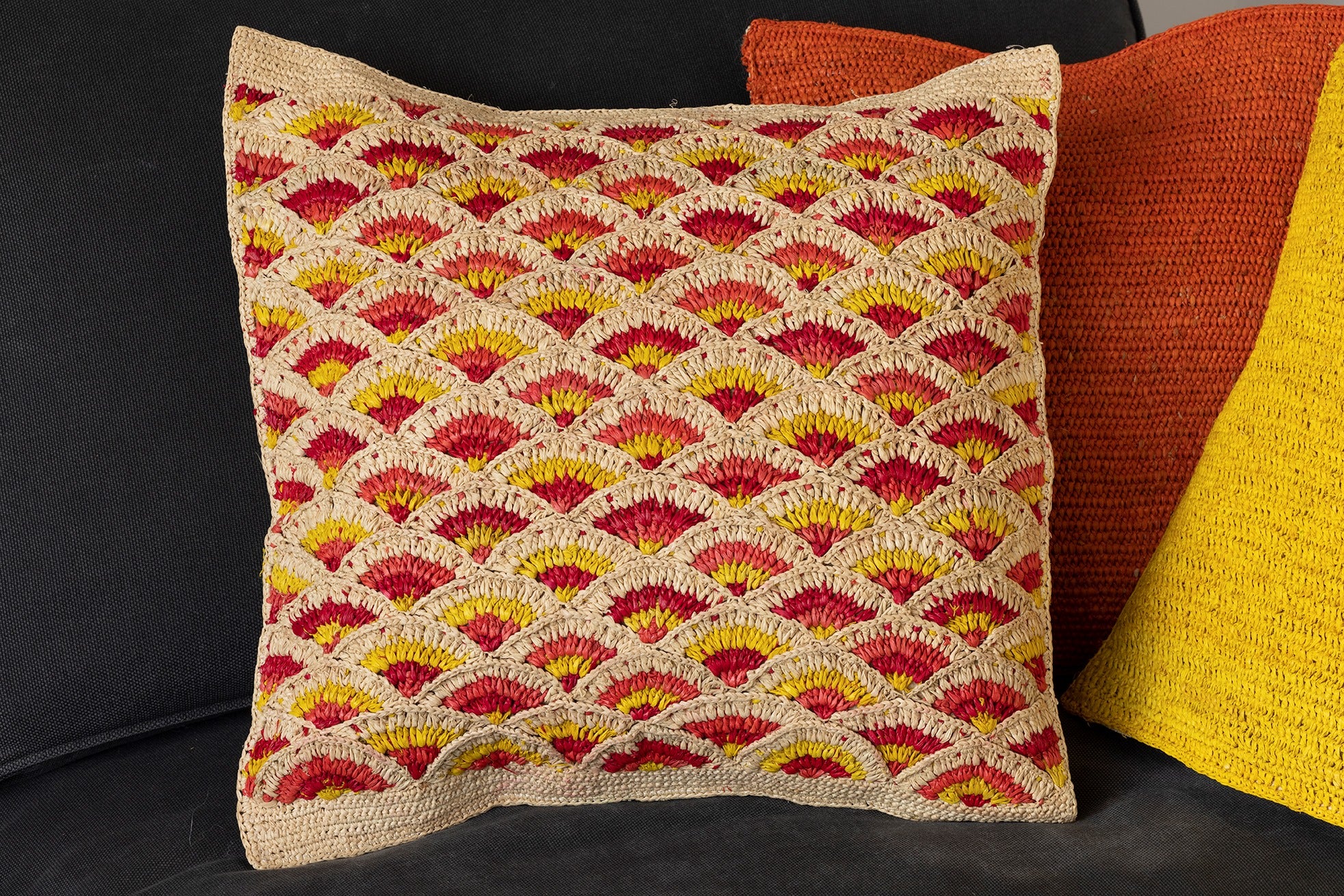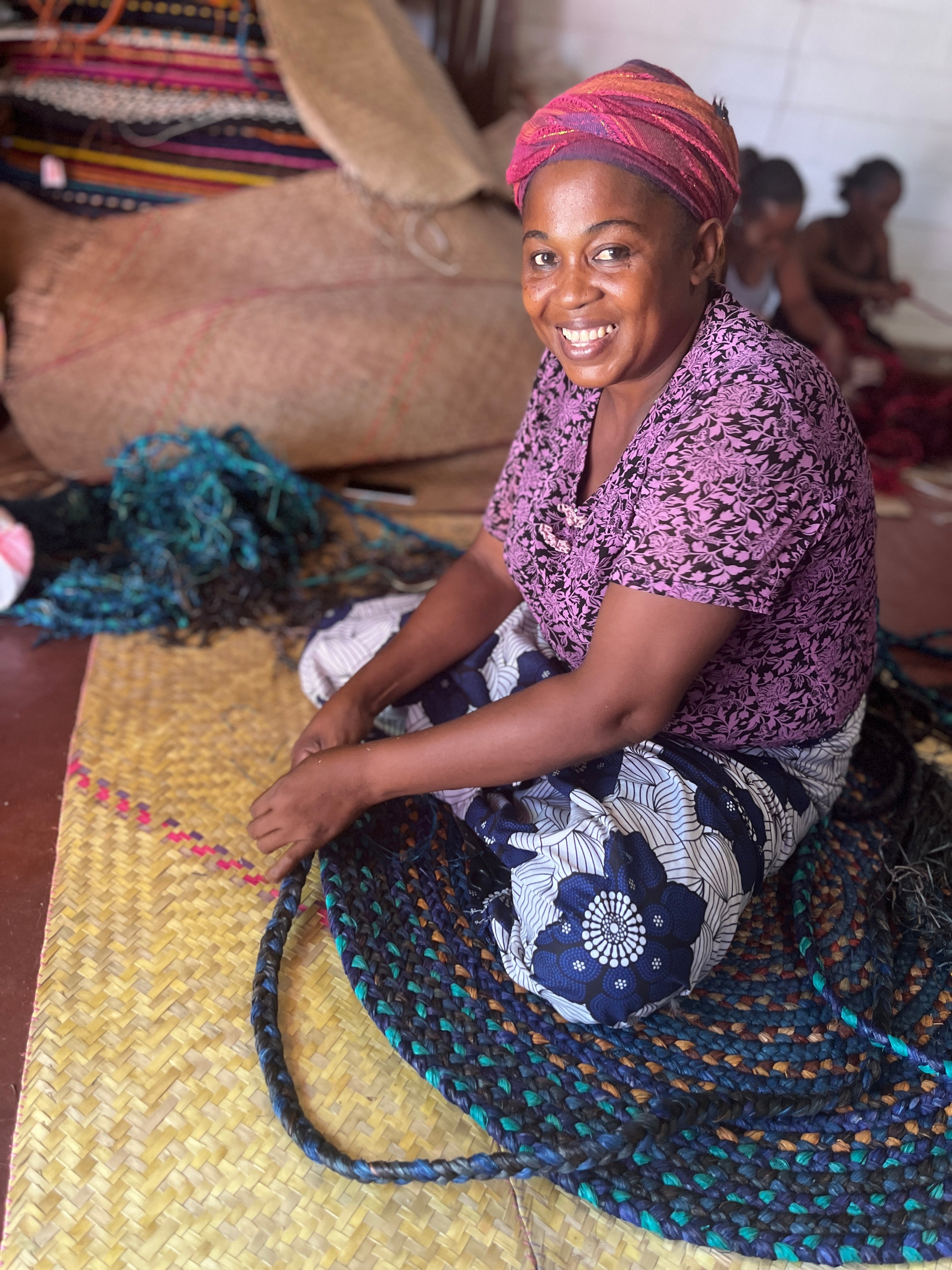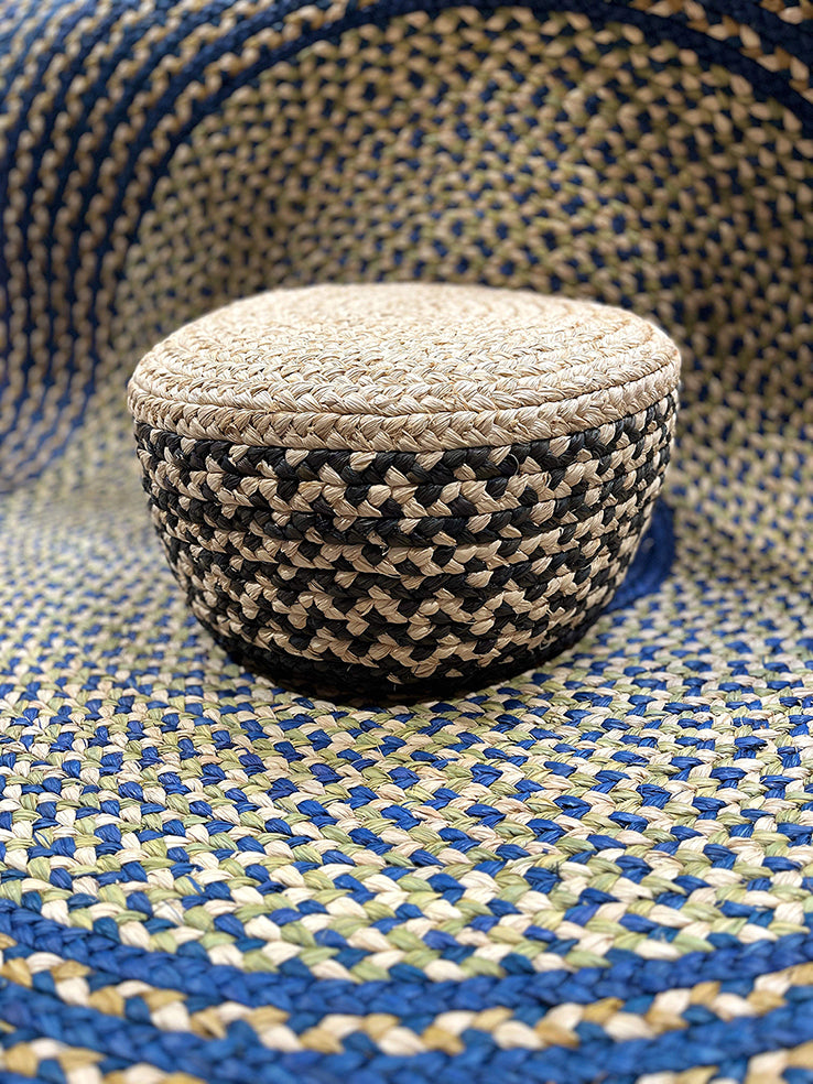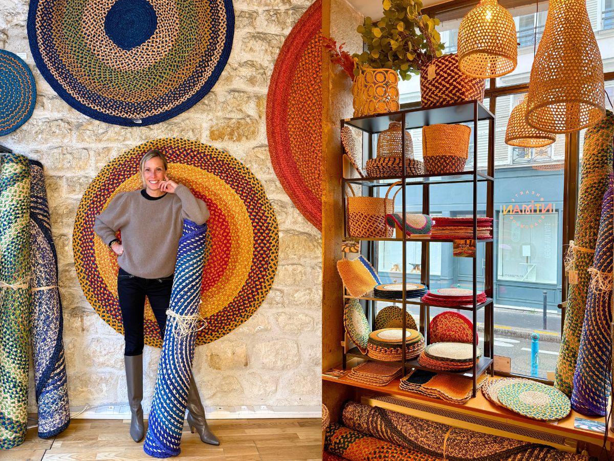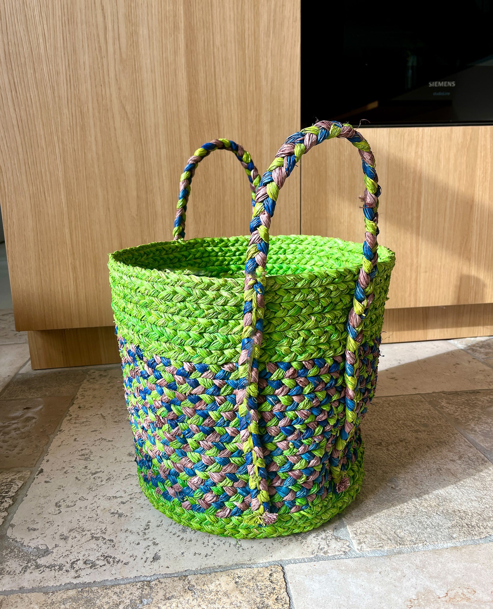 Notre pièce phare : le tapis rond coloré, fait à la main en raphia, par une association de femmes à Madagascar. Chaque pièce est unique !