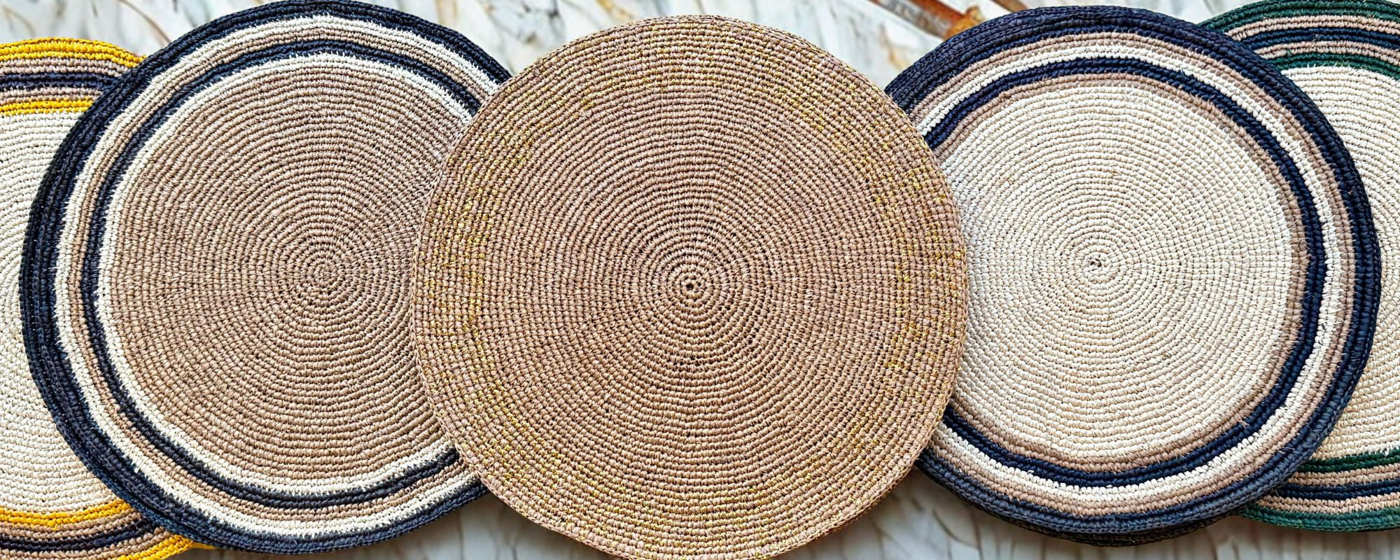 Notre pièce phare : le tapis rond coloré, fait à la main en raphia, par une association de femmes à Madagascar. Chaque pièce est unique !