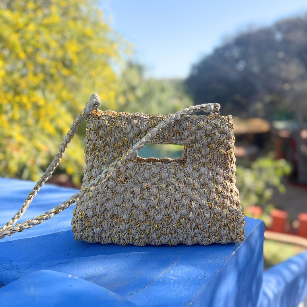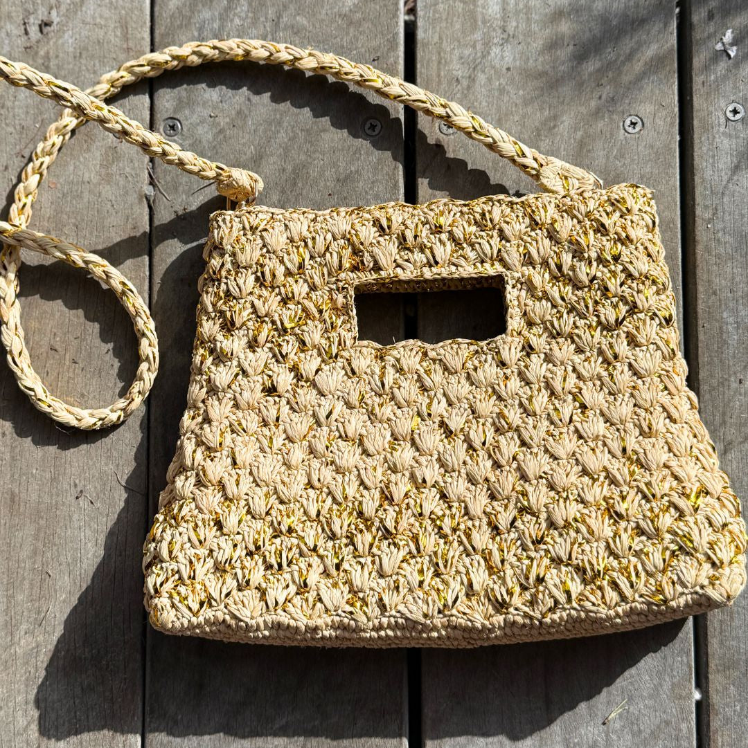 Petit sac de forme trapèze en raphia naturel entrelacé de fils de lurex doré. Ce sac peut se porter à la main par sa poignée ou à l'épaule grâce à sa bandoulière de 1,20 m en raphia fournie dans le sac, et dont les accroches sont à l'intérieur du sac. Ce petit cabas a été confectionné avec le plus grand soin à la main durant 4 jours par les artisanes de notre atelier de Tananarive à Madagascar. A découvrir dès le 25 avril au Bon Marché à Paris 7. Pourquoi on l'adore : pour sa petite taille très mignonne et sa couleur qui s'adapte à toutes les tenues d'été ! Version chic portée à la main ou glissée sous l'épaule, ou version nomade portée en cross body avec la bandoulière.