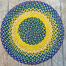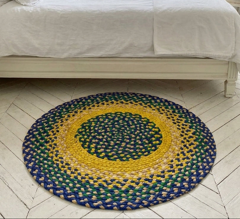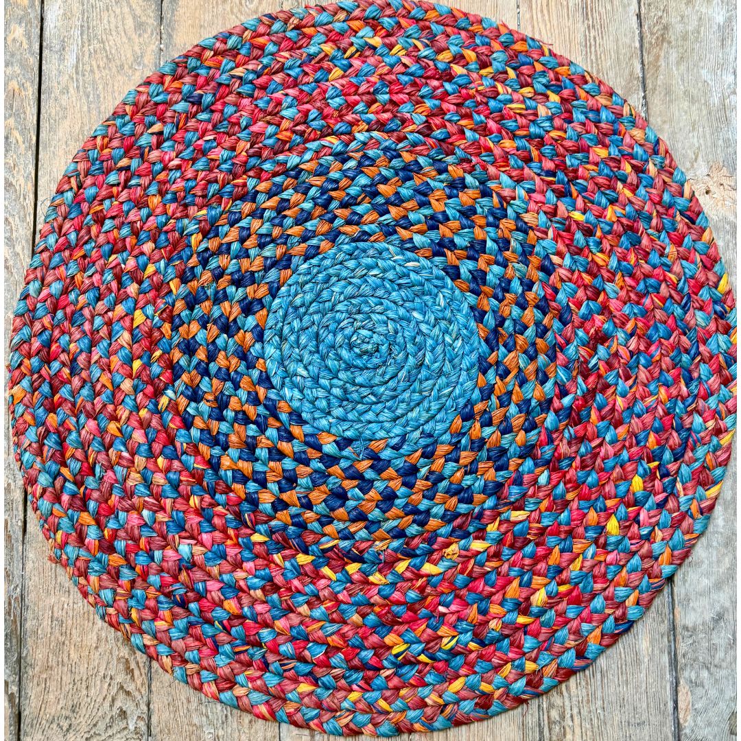 Mini tapis rond de diamètre 60 cm en raphia, tressé à la main par Bella de l'association Rouge Beauté. Un petit modèle joyeux de 60 cm de diamètre qui peut être utilisée en déco murale, au centre d'une grande table ou encore en descente de lit ou dans un dressing. Chaque tapis est unique! Les artisanes créent leurs teintures pour le raphia et tressent chacune à leur manière, réalisant des motifs différents qui font ressortir les couleurs dans des harmonies inattendues. Elles forment une longue tresse avec le raphia, qu'elles complètent au fur et à mesure. Les tapis ainsi formés mesurent entre 60 cm et 230 cm de diamètre pour des résultats très variés. Ce sont des pièces uniques. Il faut compter 2 jours de fabrication pour un tapis de 60 cm.