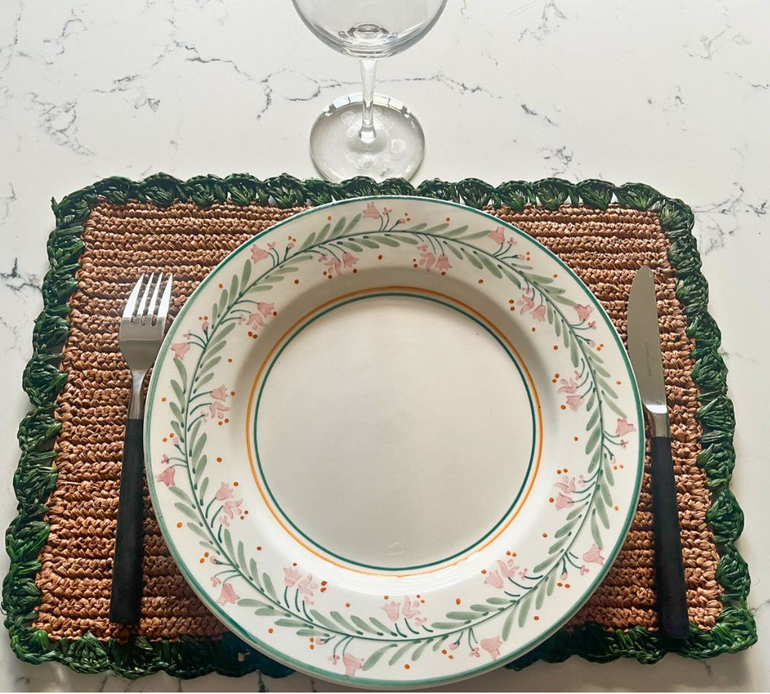 Lot de 6 x sets de table ronds en raphia bordures vertes
