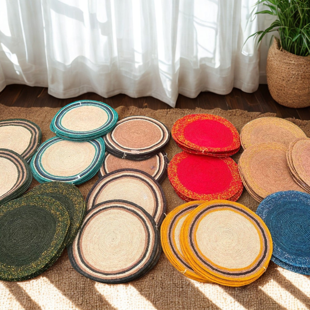 Sets de table fin en raphia rouge avec une bordure en fil doré. Faits à la main à Tananarive, ces sets de table donnent un style ethnique chic à une table, se marient aussi bien avec une nappe qu'une table en bois ou en pierre. Diamètre 37 cm.