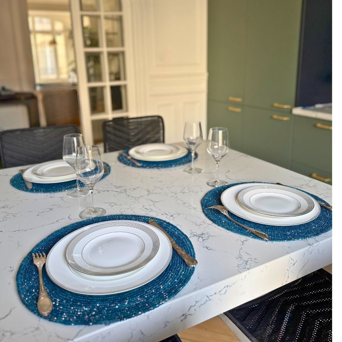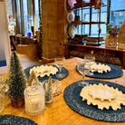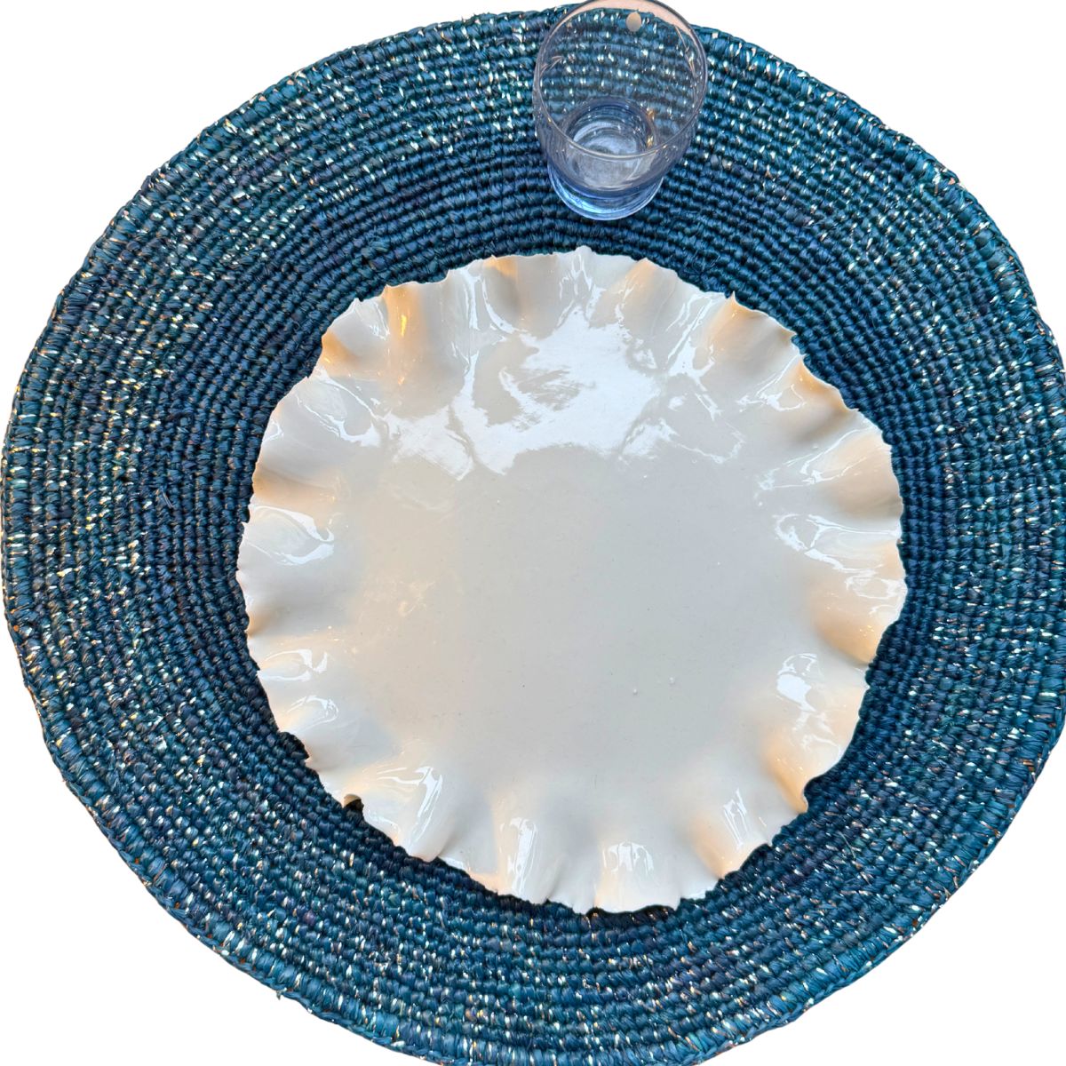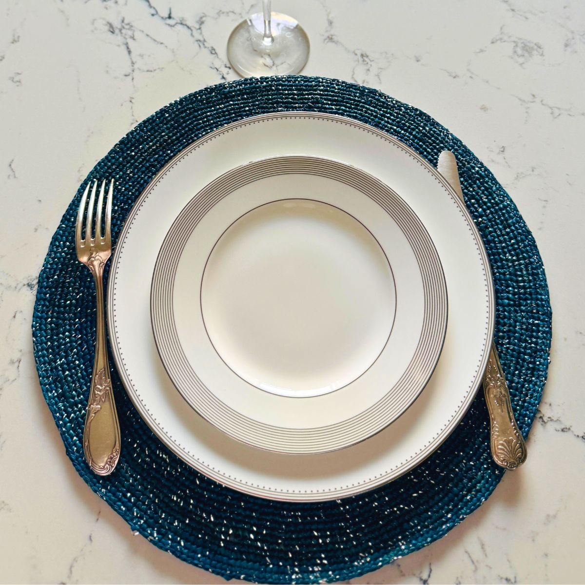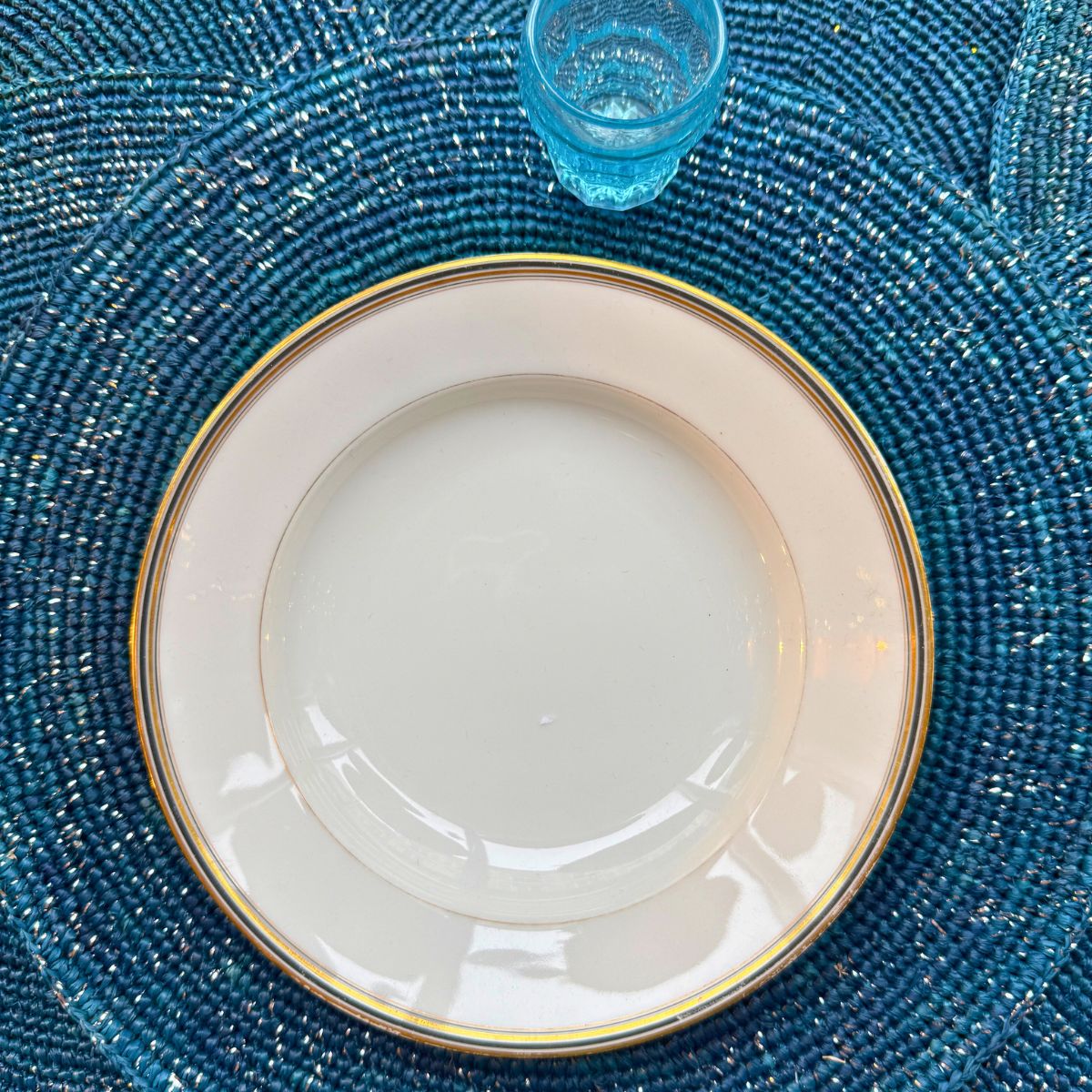 A l'unité - set de table rond en raphia bleu nuit avec bordure de fil argenté