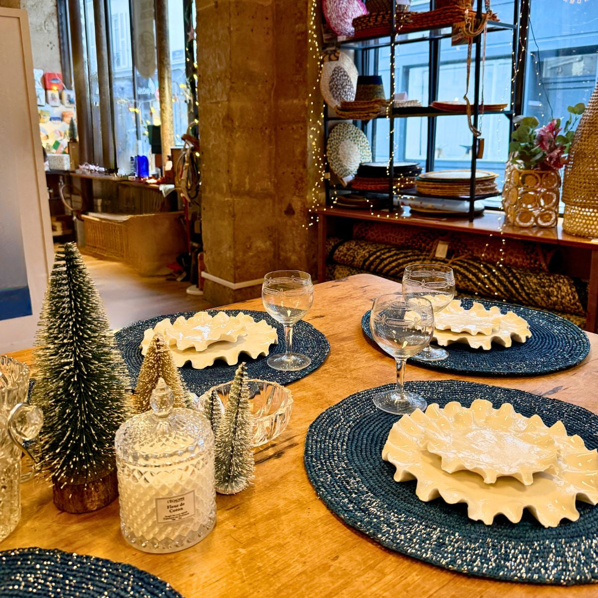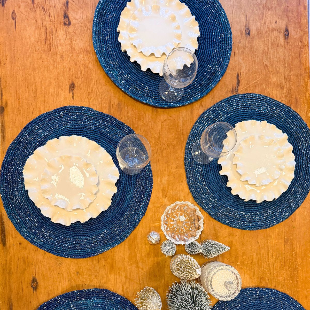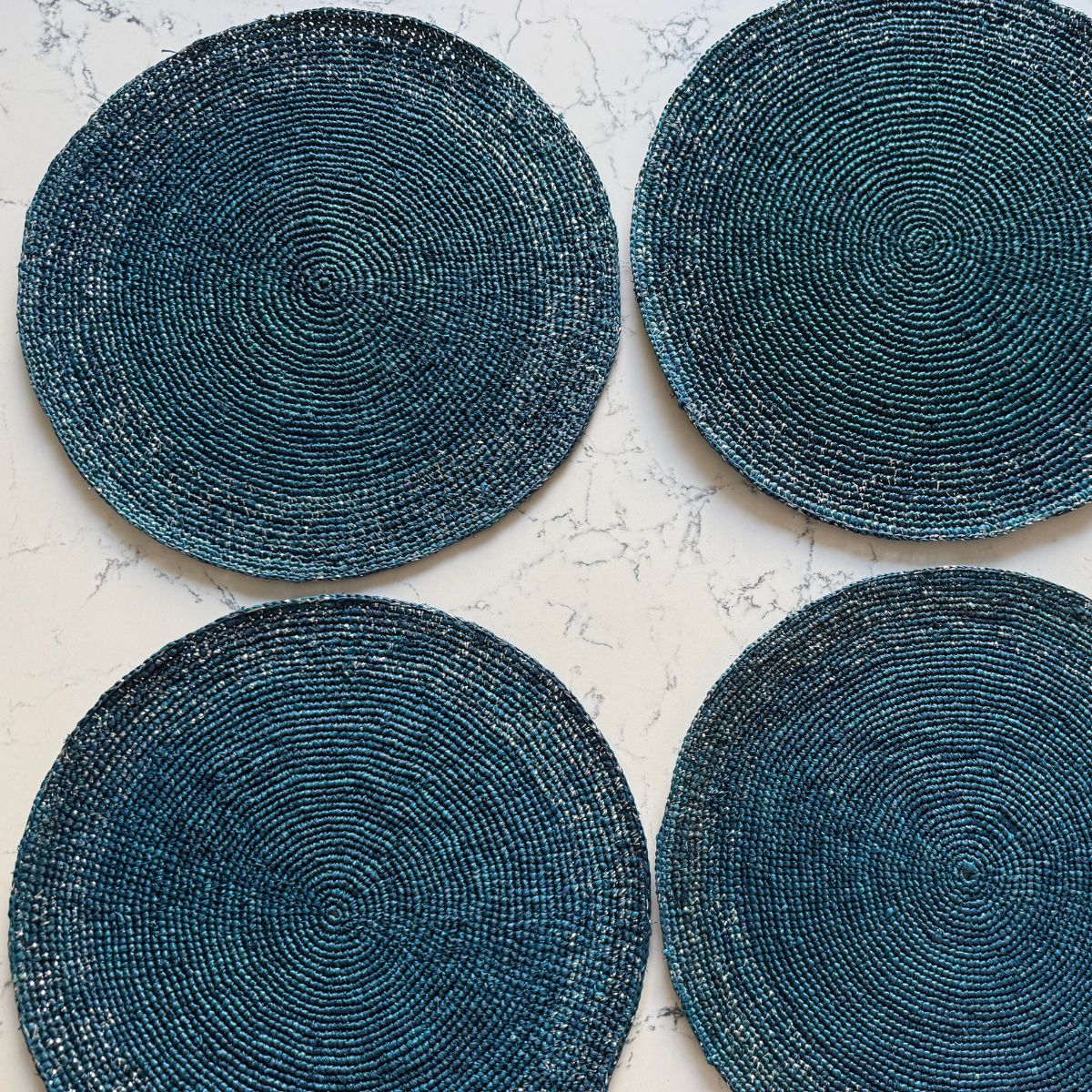 Sets de table fin en raphia bleu nuit avec une bordure en fil argenté. Faits à la main à Tananarive, ces sets de table donnent un style ethnique chic à une table, se marient aussi bien avec une nappe qu'une table en bois ou en pierre. Diamètre 37 cm.