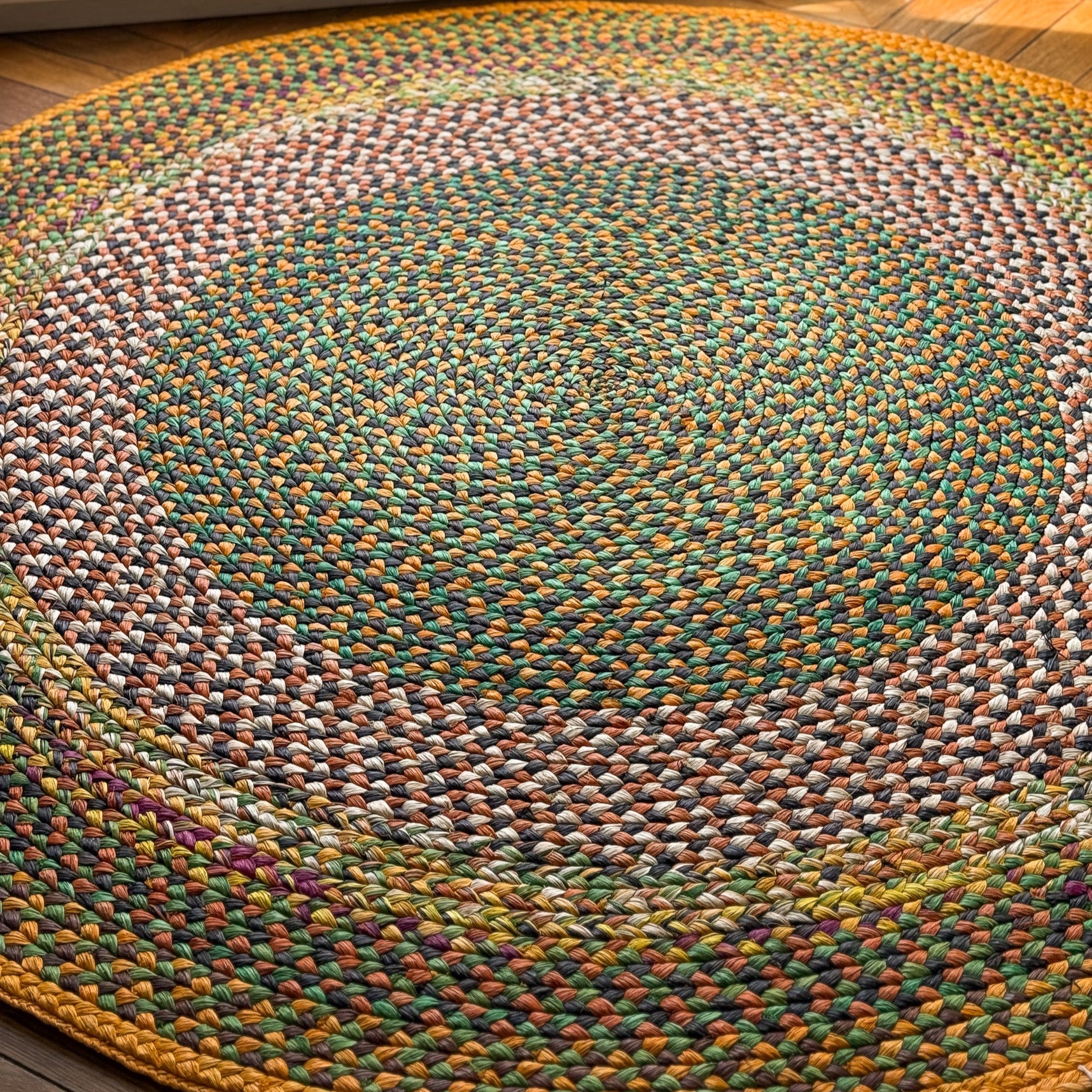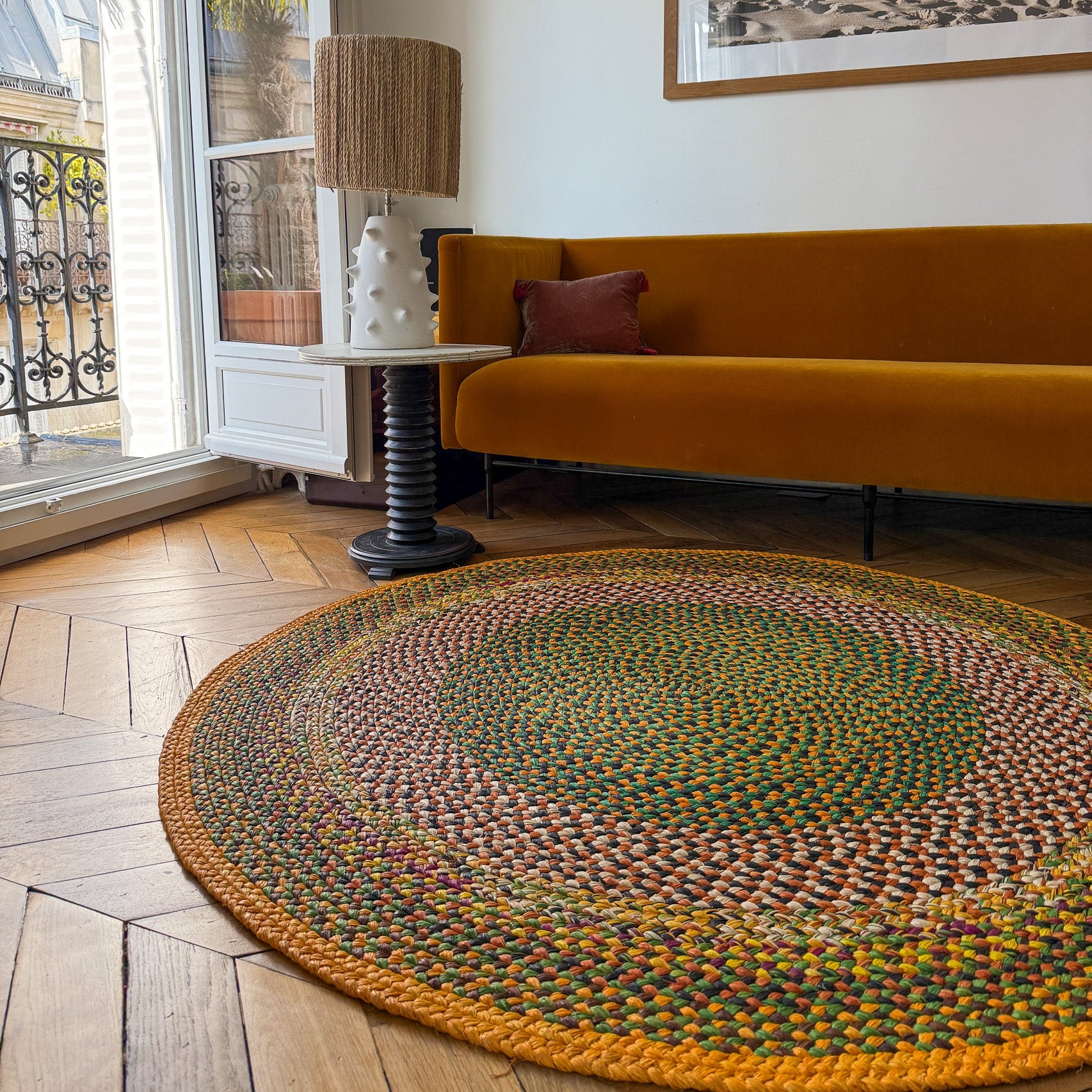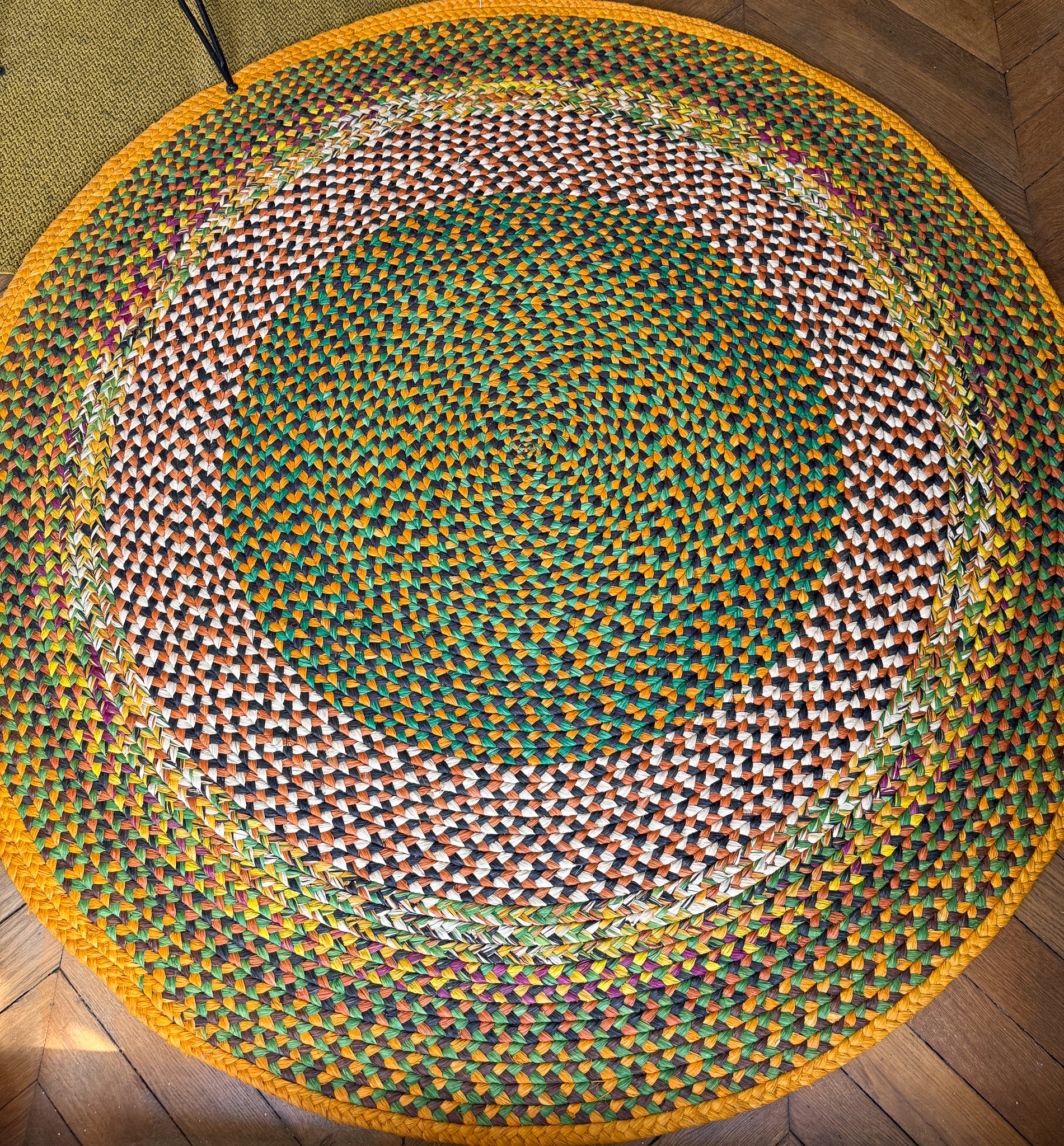 Tapis rond vert et naturel, bordure ocre – 160 cm