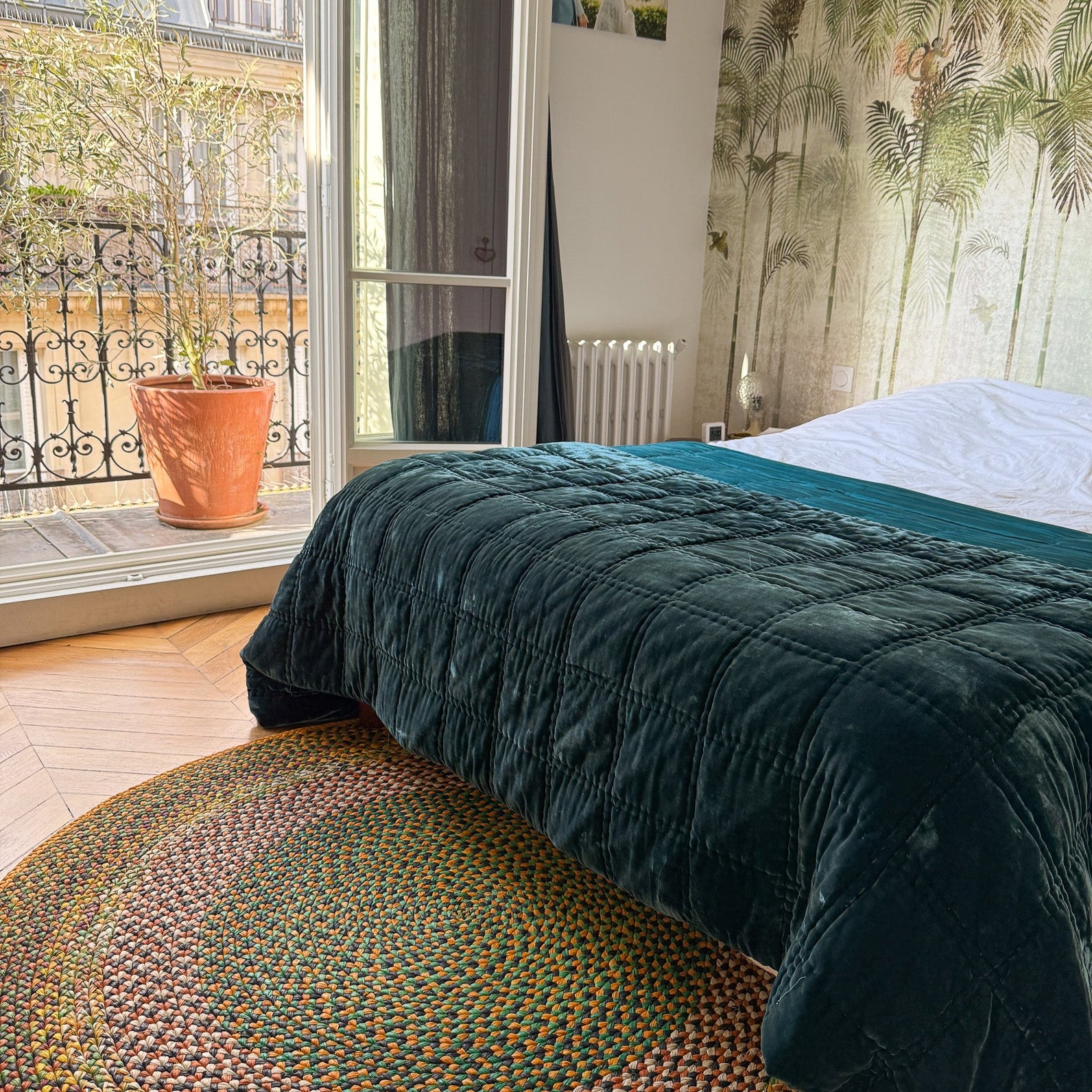 Tapis rond de diamètre 1,60 m en raphia, tressé à la main par Josiane de l'association Rouge Beauté. Un modèle élégant et décoratif avec son coeur aux différents motifs de raphia naturel, de vert et de jaune, et sa bordure jaune. Les artisanes créent leurs teintures pour le raphia et tressent chacune à leur manière, réalisant des motifs différents qui font ressortir les couleurs dans des harmonies inattendues. Elles forment une longue tresse avec le raphia, qu'elles complètent au fur et à mesure. Les tapis ainsi formés mesurent entre 60 cm et 230 cm de diamètre pour des résultats très variés. Ce sont des pièces uniques. Il faut compter 4 jours de fabrication pour un tapis de 1 m, et près de 3 semaines pour un tapis de 2 m de diamètre.