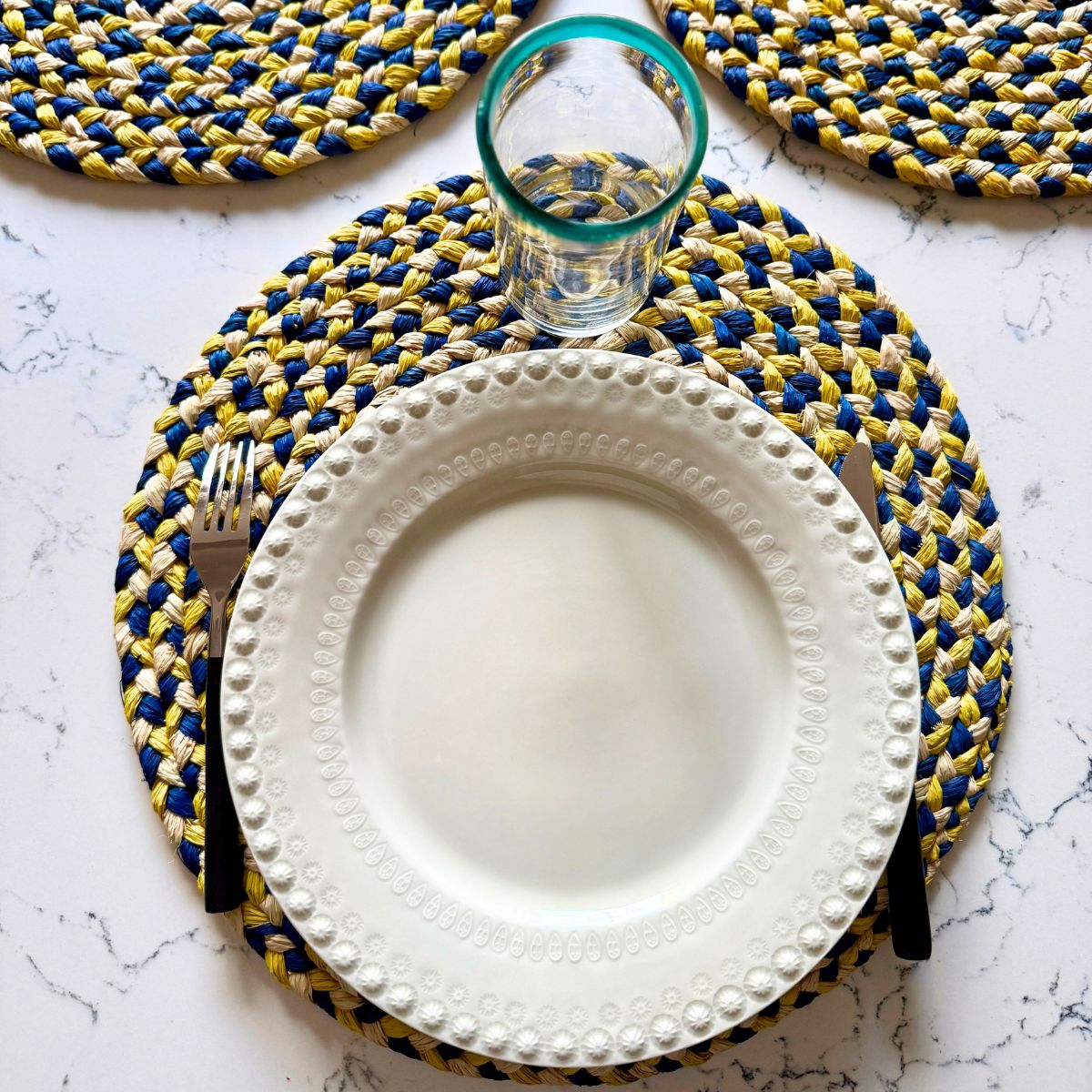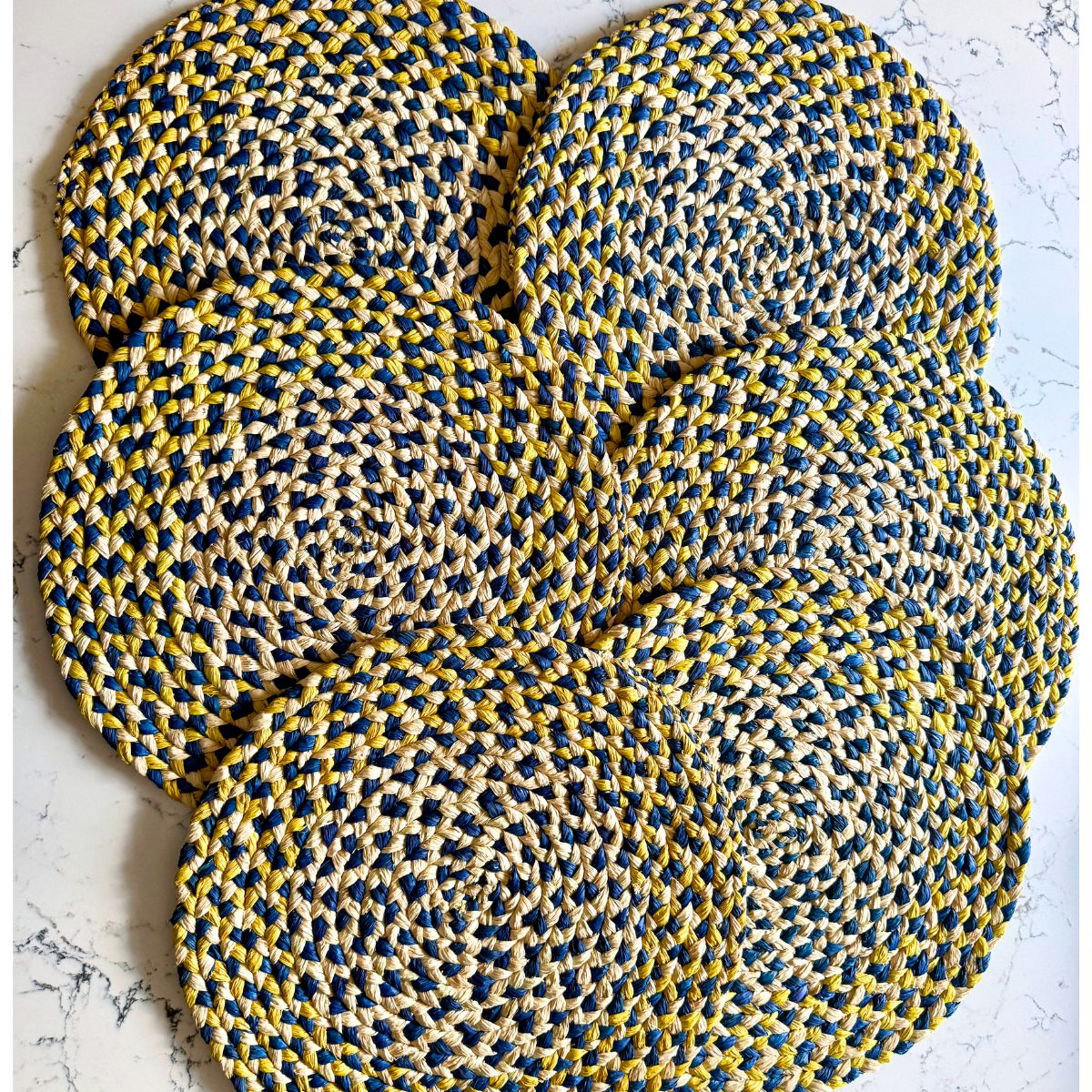 Lot de 6 sets de table en raphia épais, faits à la main par Odile dans le Nord Ouest de Madagascar. C'est une longue tresse de raphia naturel, bleu et jaune qui s'enroule sur elle même. Diamètre 40 cm.