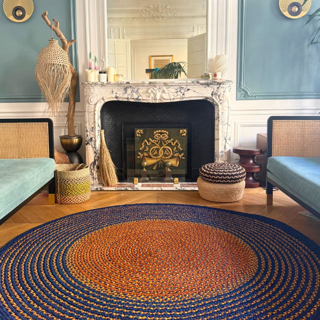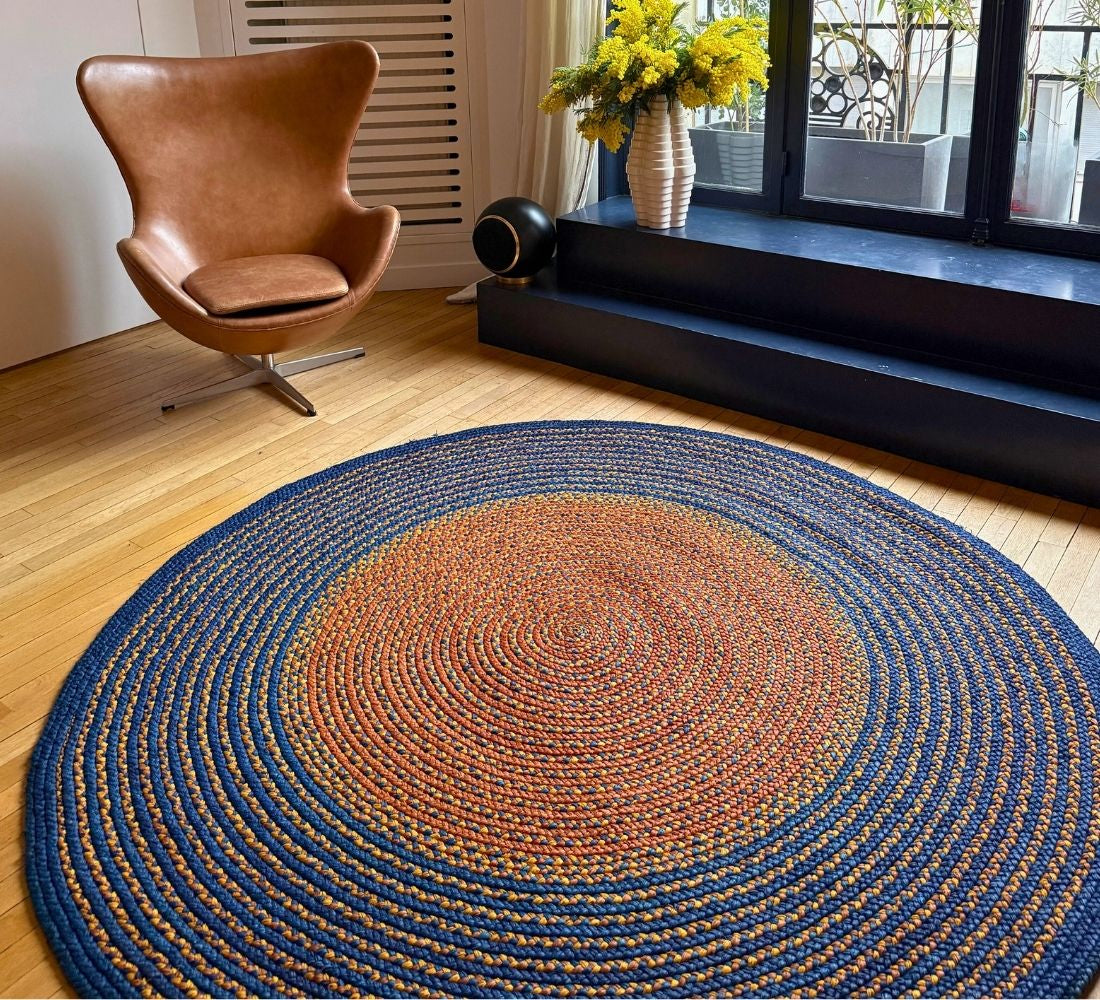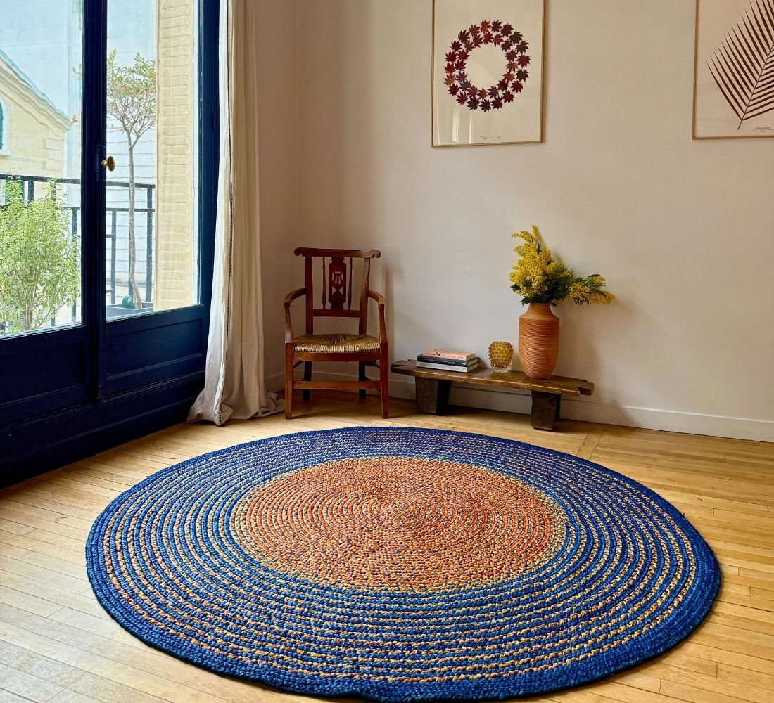 Tapis rond de diamètre 200 cm en raphia, tressé à la main par Hélène de l'association Rouge Beauté. Un modèle grand format en bleu foncé avec des touches de terracotta et un centre contrastant entre l'orange clair et le beige. Chaque tapis est unique! Chaque artisane imagine son tapis et les couleurs qui le composeront. Elle réalise elle-même la teinte du raphia. Une fois le raphia séché, elle créé une longue tresse, qu’elle poursuit en ajoutant des brins de raphia et en enroulant cette tresse sur elle-même au fur et à mesure. C’est pourquoi les tapis sont ronds. Il faut 20 jours pour réaliser un tapis de 2 mètres de diamètre.