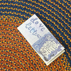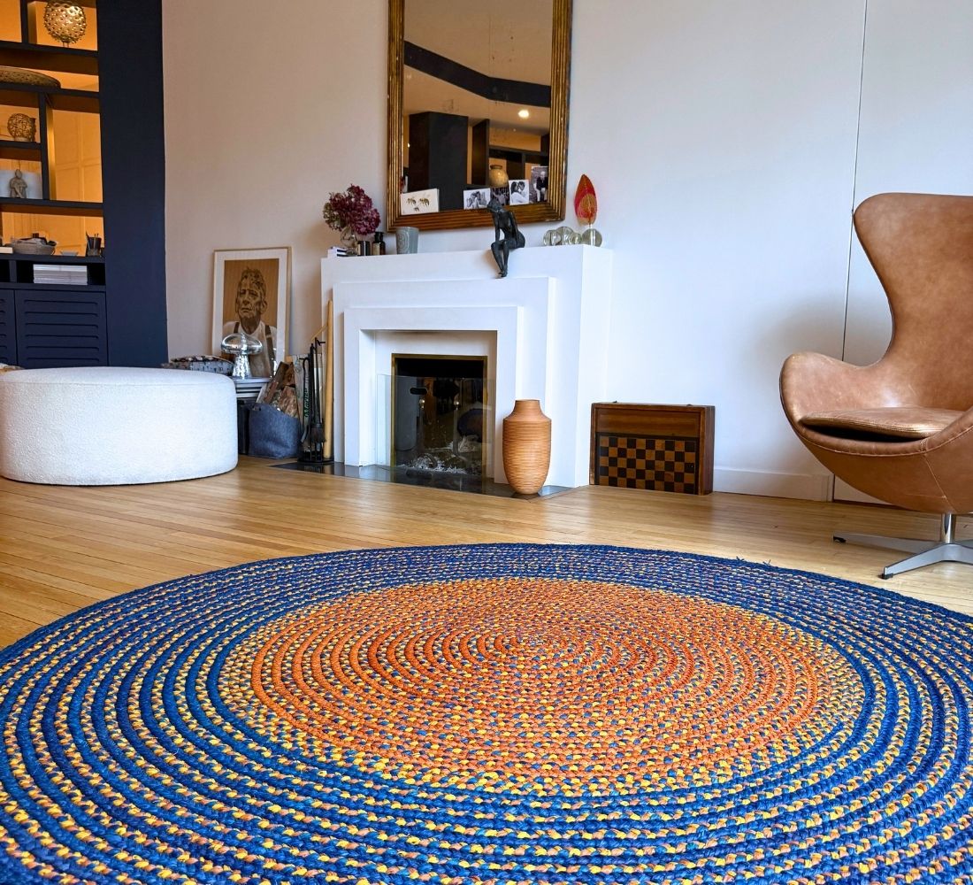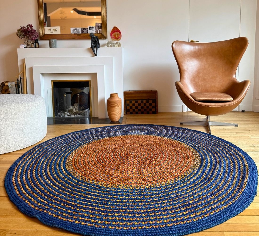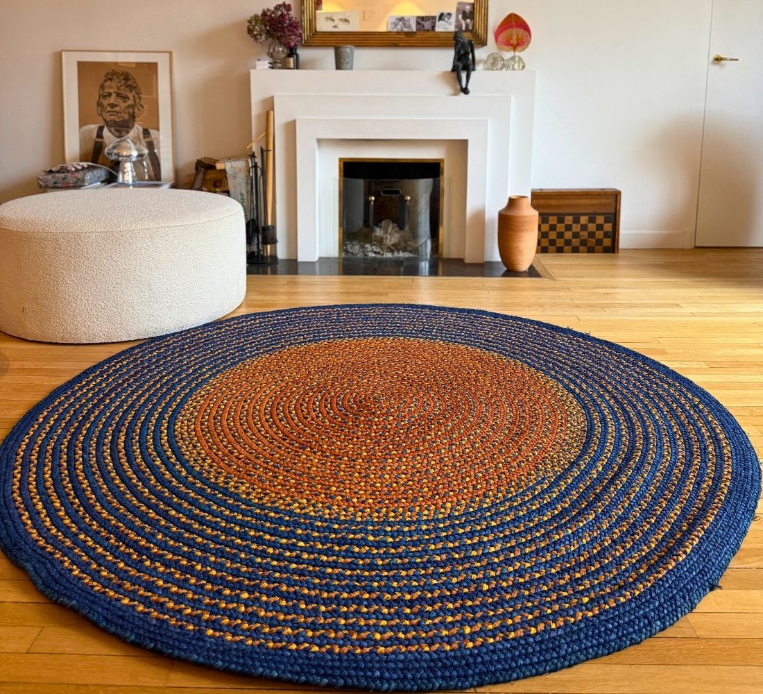 Tapis rond de diamètre 200 cm en raphia, tressé à la main par Hélène de l'association Rouge Beauté. Un modèle grand format en bleu foncé avec des touches de terracotta et un centre contrastant entre l'orange clair et le beige. Chaque tapis est unique! Chaque artisane imagine son tapis et les couleurs qui le composeront. Elle réalise elle-même la teinte du raphia. Une fois le raphia séché, elle créé une longue tresse, qu’elle poursuit en ajoutant des brins de raphia et en enroulant cette tresse sur elle-même au fur et à mesure. C’est pourquoi les tapis sont ronds. Il faut 20 jours pour réaliser un tapis de 2 mètres de diamètre.