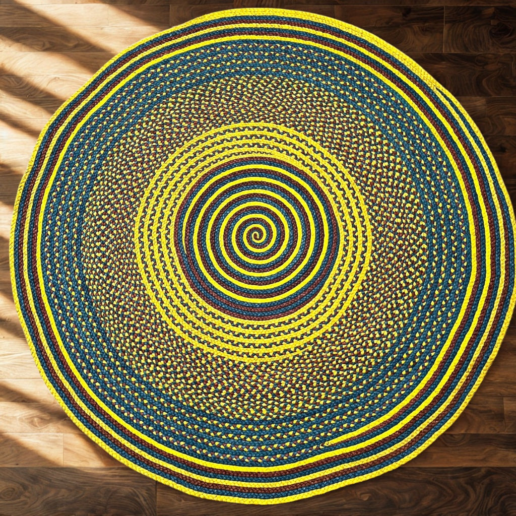 Tapis en raphia rond bleu vif, jaune citron et brun – 200 cm