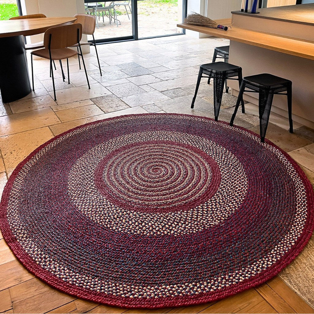 Tapis rond de diamètre 200 cm en raphia, tressé à la main par Célina de l'association Rouge Beauté. Un tapis aux couleurs profondes et contrastées entre le raphia naturel et des tonalités de prune, de rouge et quelques touches de bleu. Chaque tapis est unique! Chaque artisane imagine son tapis et les couleurs qui le composeront. Elle réalise elle-même la teinte du raphia. Une fois le raphia séché, elle crée une longue tresse, qu’elle poursuit en ajoutant des brins de raphia et en enroulant cette tresse sur elle-même au fur et à mesure. C’est pourquoi les tapis sont ronds. Il faut près de 3 semaines pour réaliser un tapis de 2 mètres de diamètre.