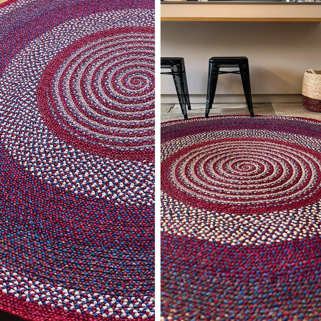 Tapis en raphia rond naturel, prune, rouge et bleu – 200 cm
