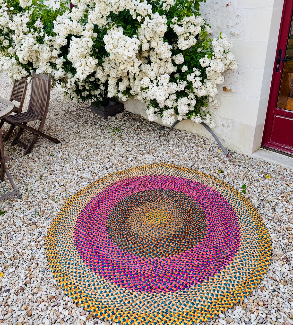 Tapis rond de diamètre 1,70 m en raphia, tressé à la main par Juliana de l'association Rouge Beauté. Un modèle de taille moyenne aux douces et lumineuses tonalités de rose, de jaune et brun et de raphia naturel. Chaque tapis est unique! Chaque artisane imagine son tapis et les couleurs qui le composeront. Elle réalise elle-même la teinte du raphia. Une fois le raphia séché, elle créé une longue tresse, qu’elle poursuit en ajoutant des brins de raphia et en enroulant cette tresse sur elle-même au fur et à mesure. C’est pourquoi les tapis sont ronds. Il faut 2 semaines pour tresser un tapis de 1,70m.
