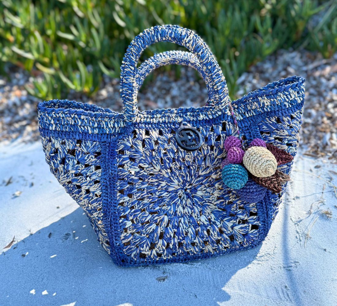 Adjustable and removable raffia shoulder strap - blue & multicolor