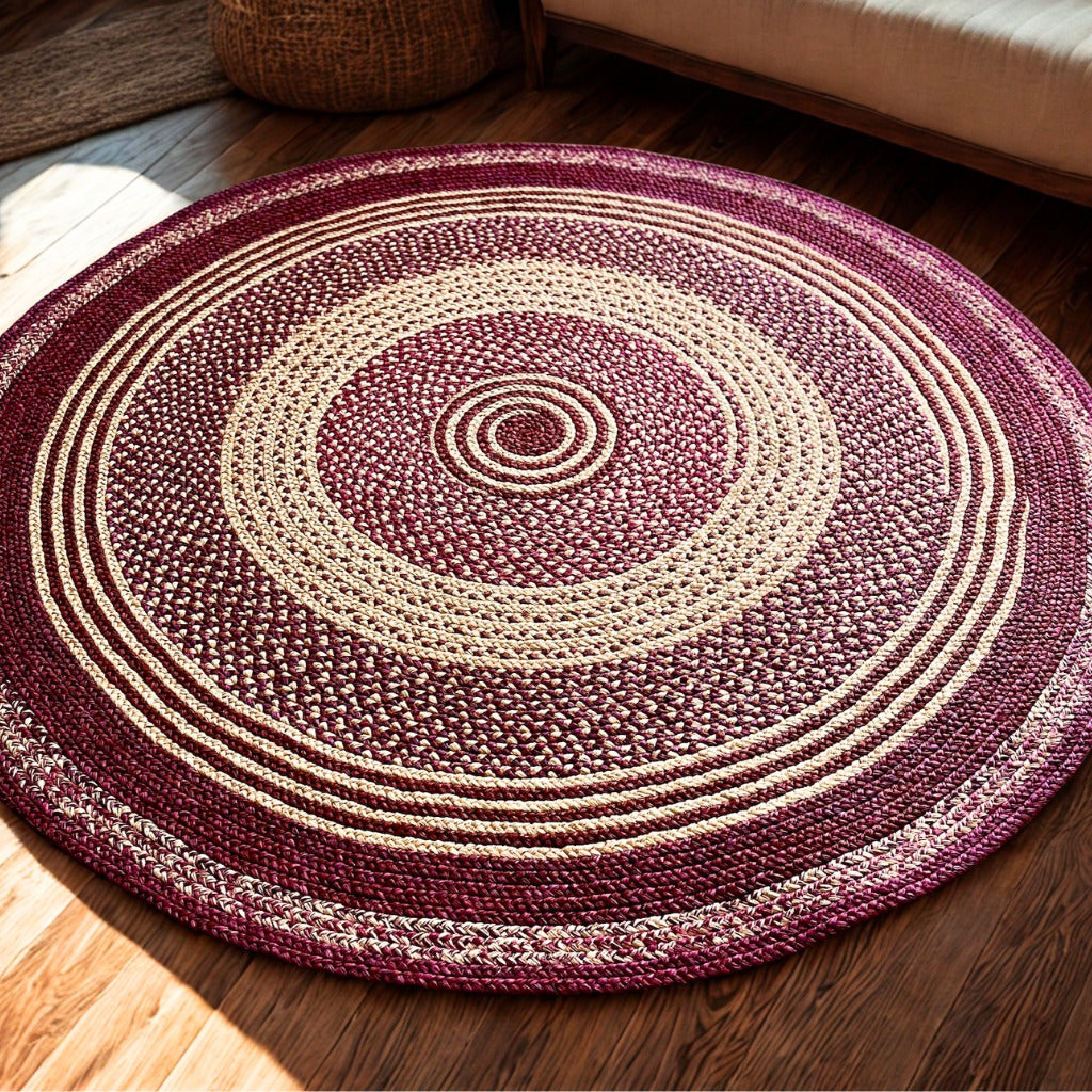 Round rug, 200 cm in diameter, made of raffia, hand-woven by Mahareta from the Rouge Beauté association. A model interweaving undyed natural coloured raffia with tones of plum and brown. Each rug is unique! Each craftswoman imagines her rug and the colors that will compose it. She herself makes the shade of the raffia. Once the raffia is dry, she creates a long braid, which she continues by adding strands of raffia and winding this braid on itself as she goes. That's why rugs are round. It takes about 3 weeks to make a 2-meter diameter carpet.
