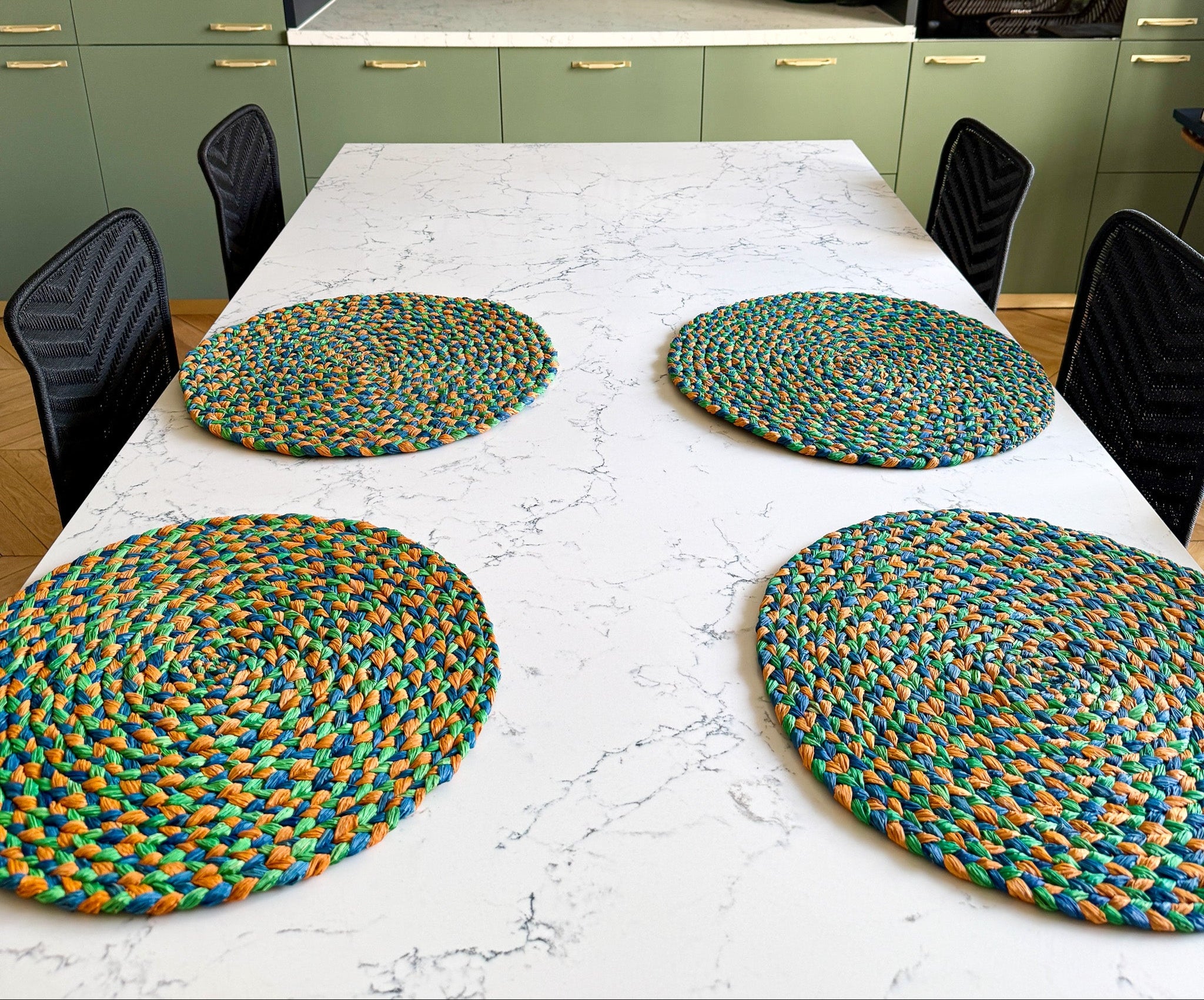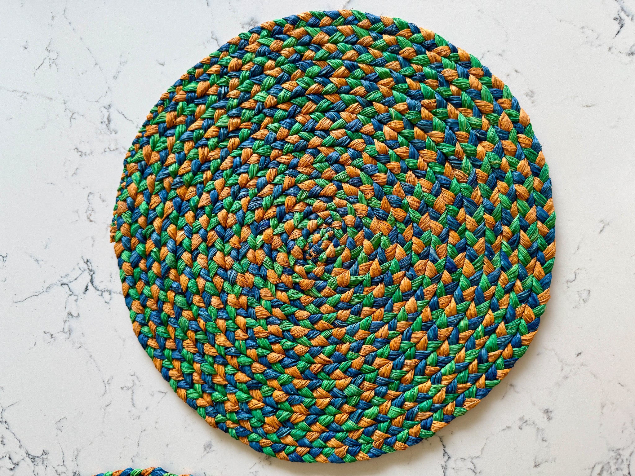 Set of 6 x round placemats in natural raffia with emerald green border - Elena