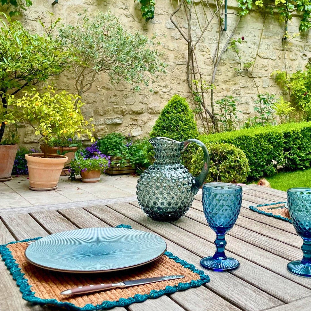 Handmade in Madagascar, each set brings an artisanal touch to your table. The natural raffia adds a unique texture and the blue border brings a pop of color to your meals.