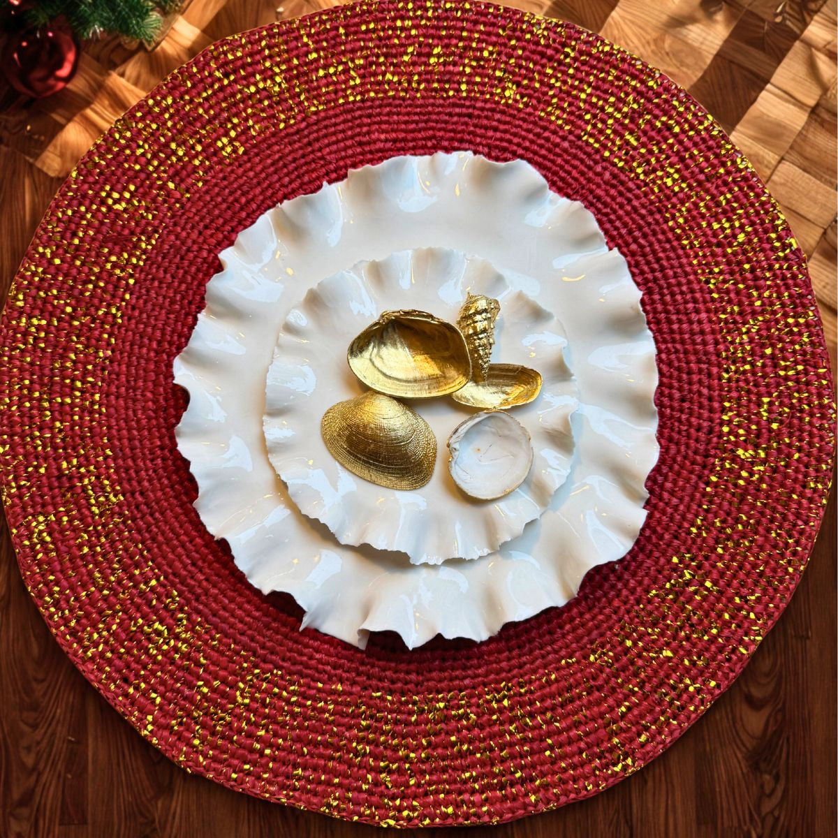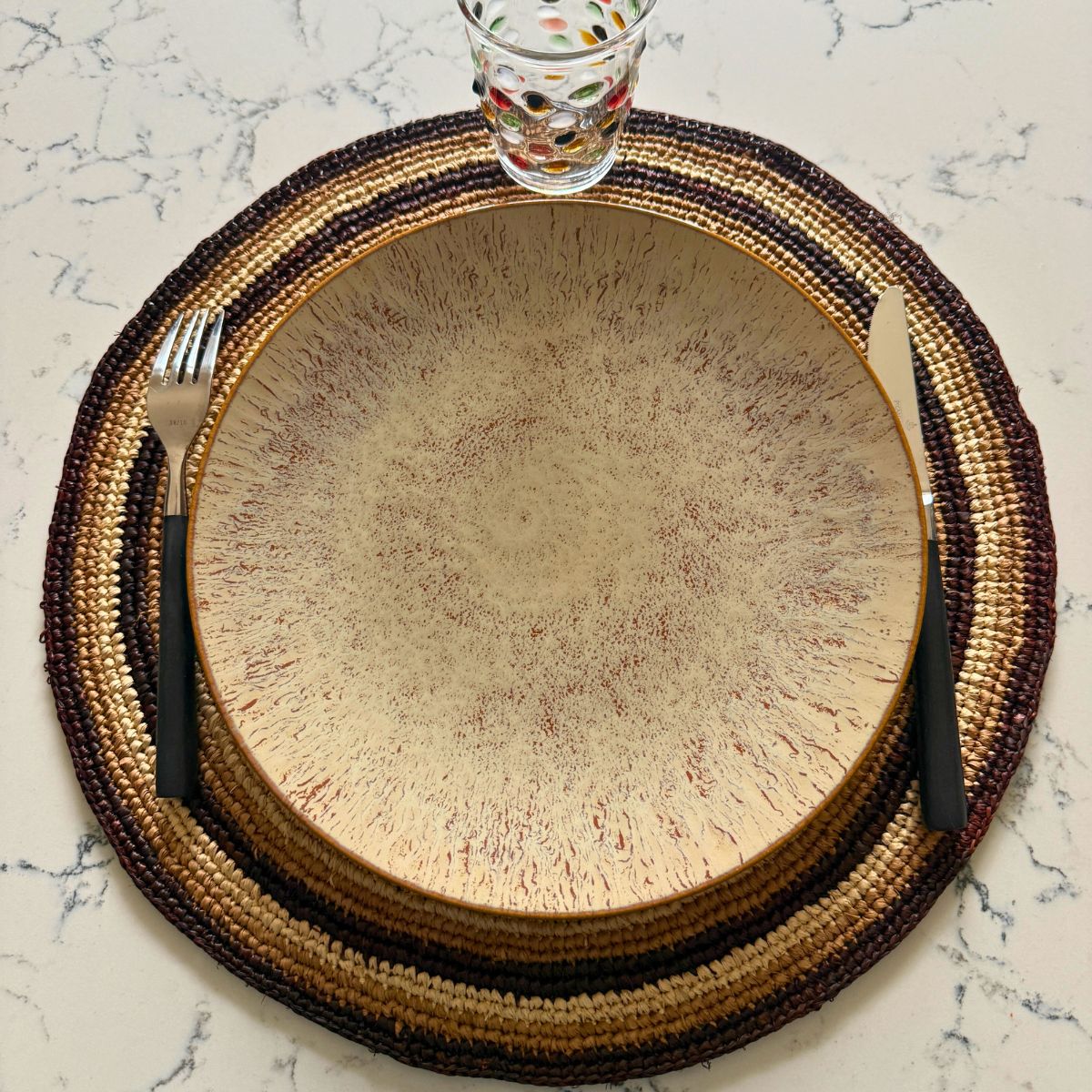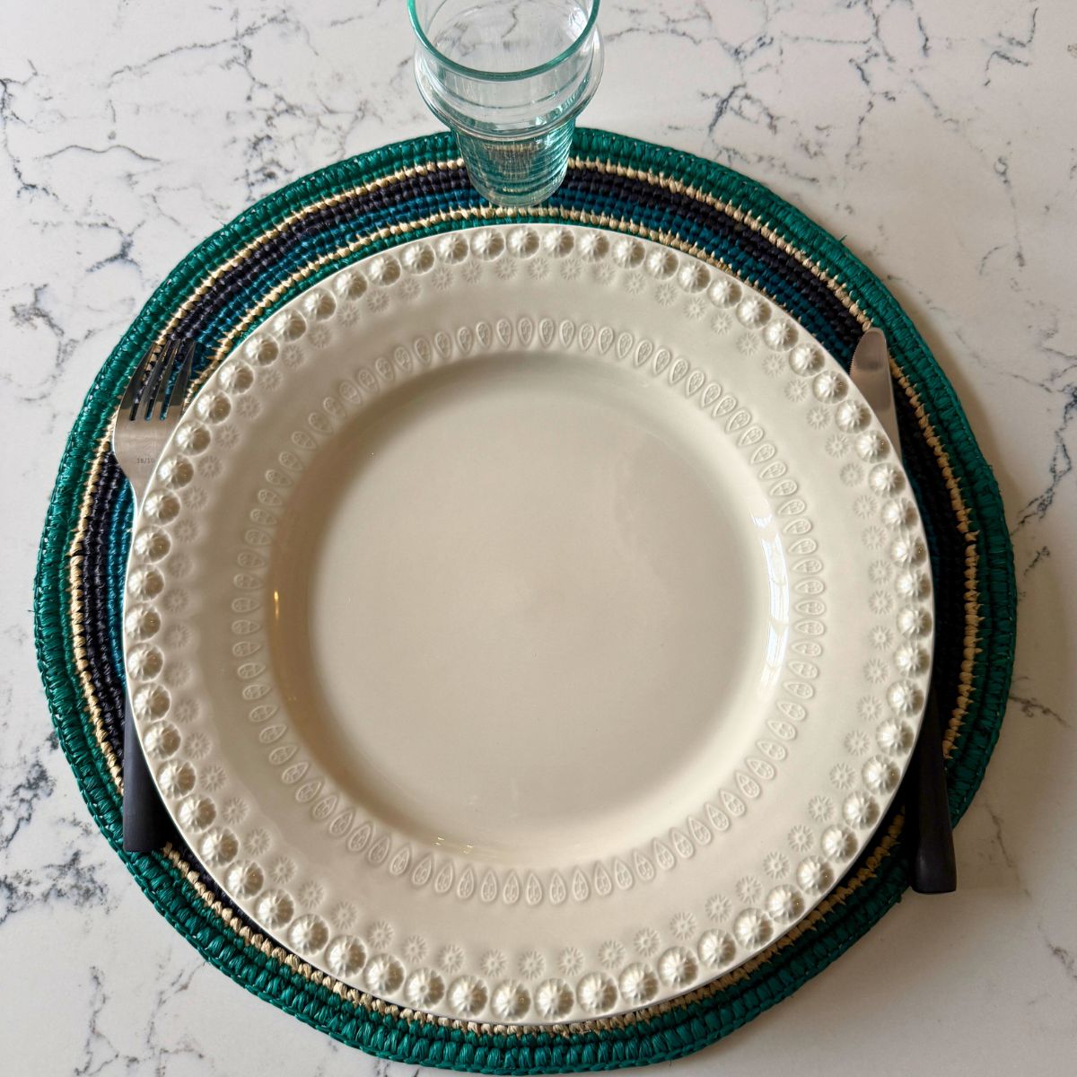 Set of 6 x round placemats in natural raffia with emerald green border - Elena