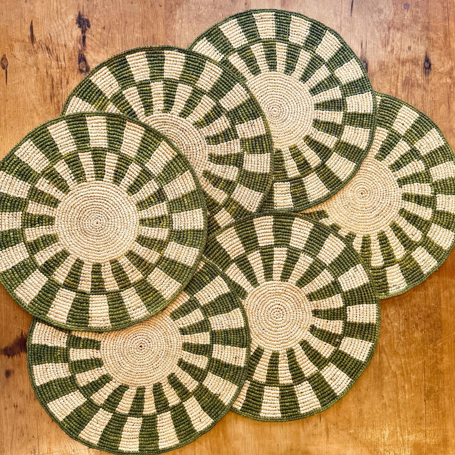 Set of 6 pink raffia placemats highlighted with a black line and a denim blue border, handmade by Tsiahivana. Handmade in Madagascar, each set brings an artisanal touch to your table.