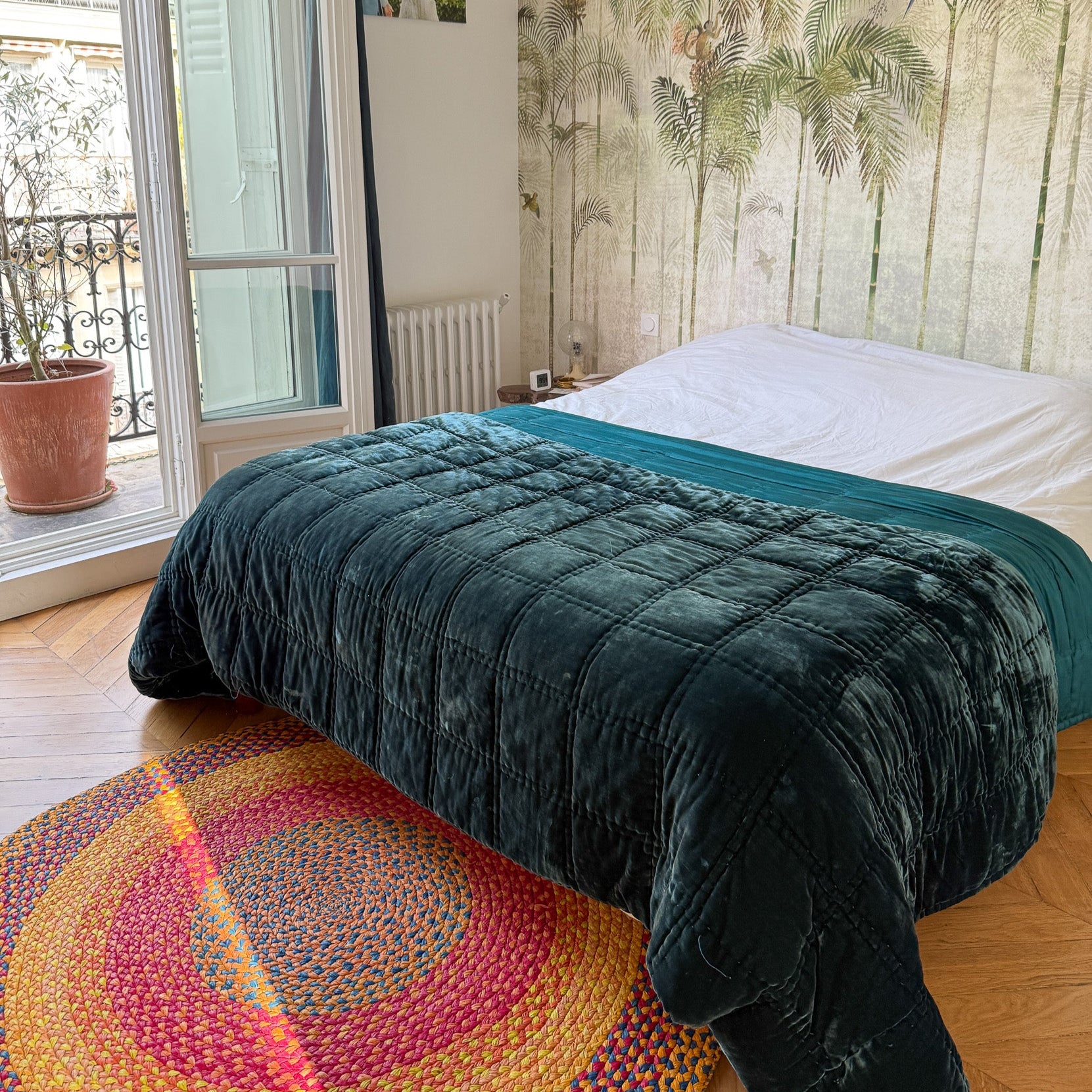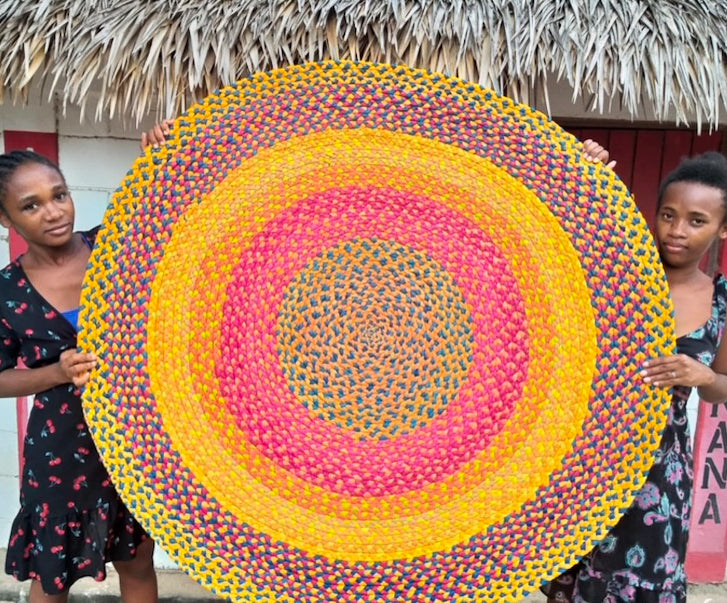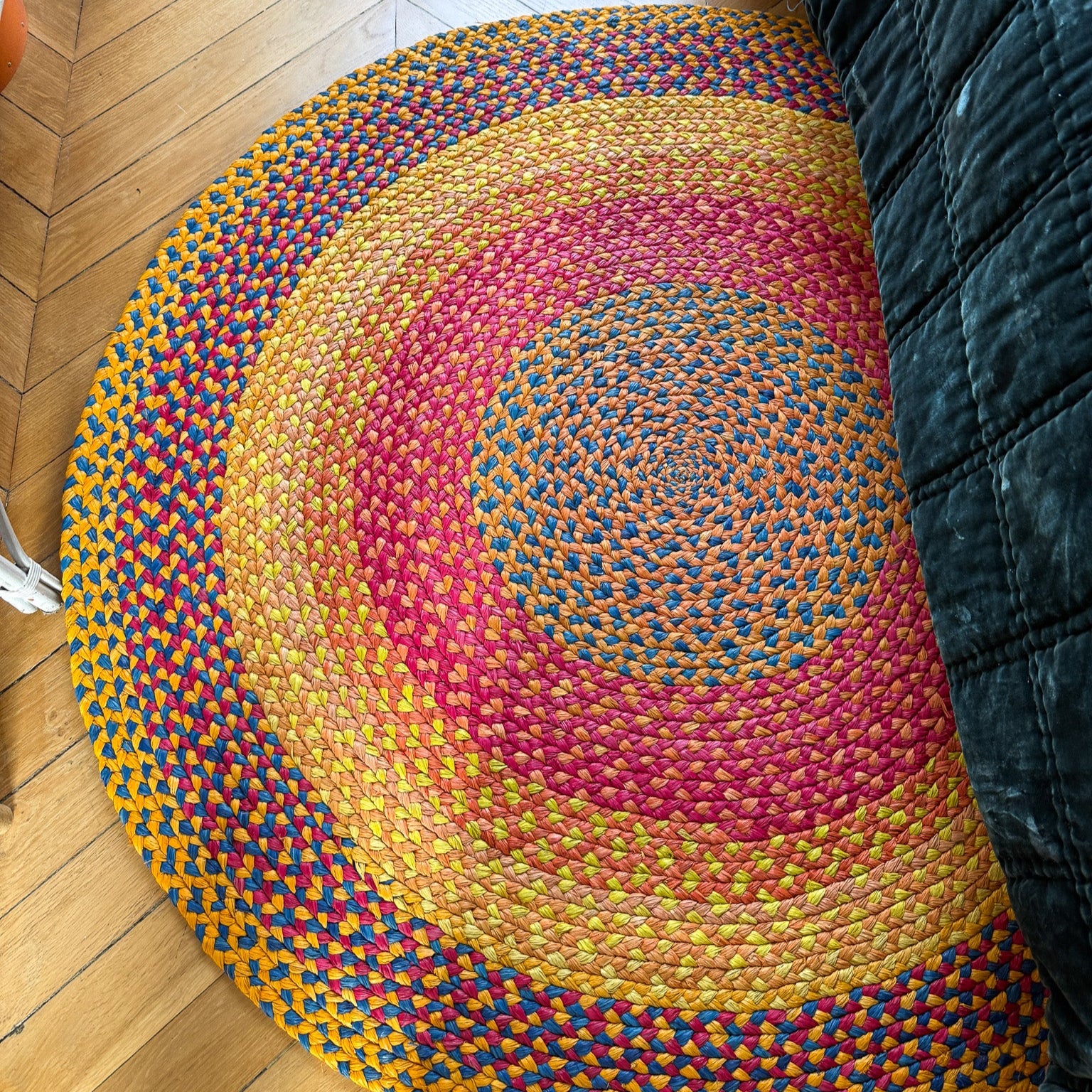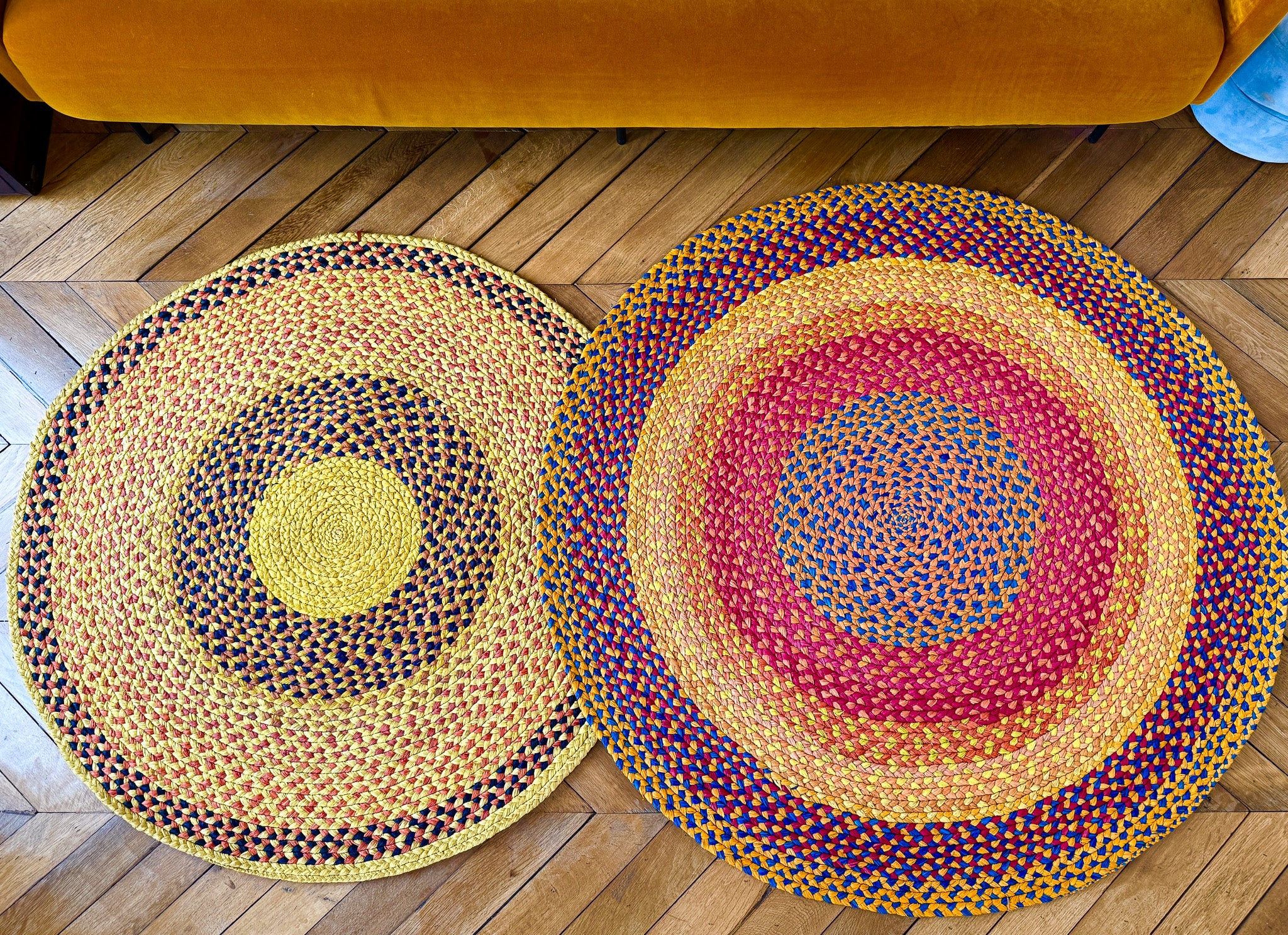 Round rug, 200 cm in diameter, made of raffia, hand-woven by Julienne from the Rouge Beauté association. A model with wide bands of gray raffia alternating with yellow raffia and different shades of blue. Each rug is unique! Each craftswoman imagines her rug and the colors that will compose it. She herself makes the shade of the raffia. Once the raffia is dry, she creates a long braid, which she continues by adding strands of raffia and winding this braid on itself as she goes. That's why rugs are round. It takes about 3 weeks to make a 2-meter diameter carpet.