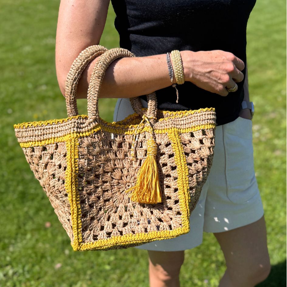 Raffia fanny pack, with gold zip, and adjustable and removable shoulder strap in lightly smoked “tea” and blue raffia. It is hand crocheted and assembled entirely by hand over 4 days in a workshop in Tananarive. The Mia fanny pack is the accessory of summer 2024! Practical and easy to live with, it supports a mobile life with style.