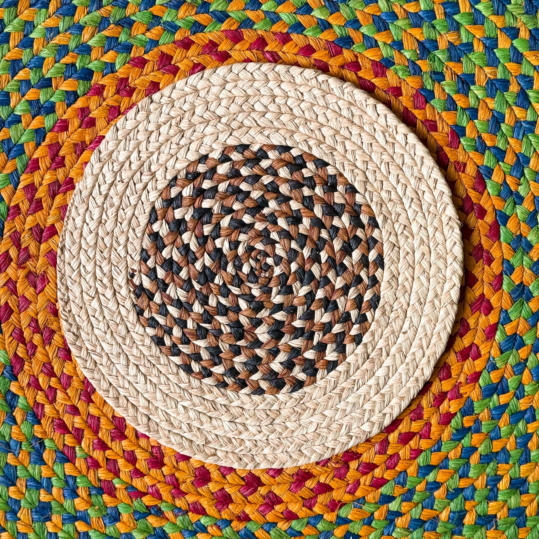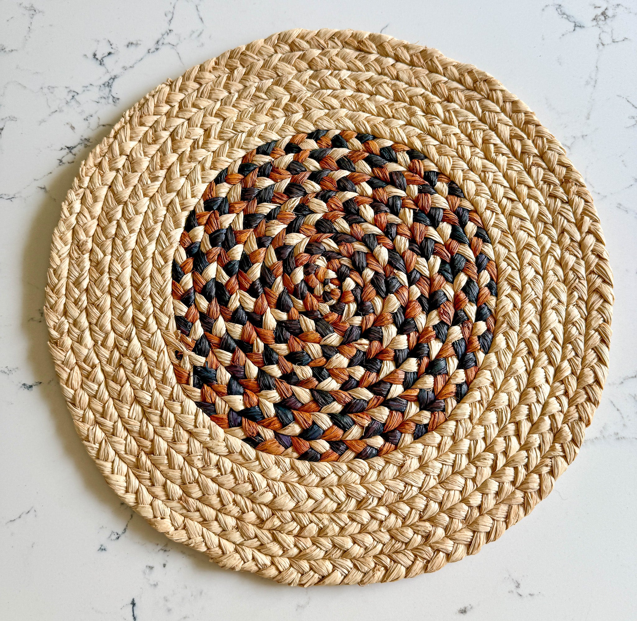 Set of 6 placemats in natural raffia, handmade by Elena. This set of 6 placemats is made of natural, bordered by a black line and a thicker border tinted with emerald green. Handmade in Madagascar, each set brings an artisanal touch to your table.