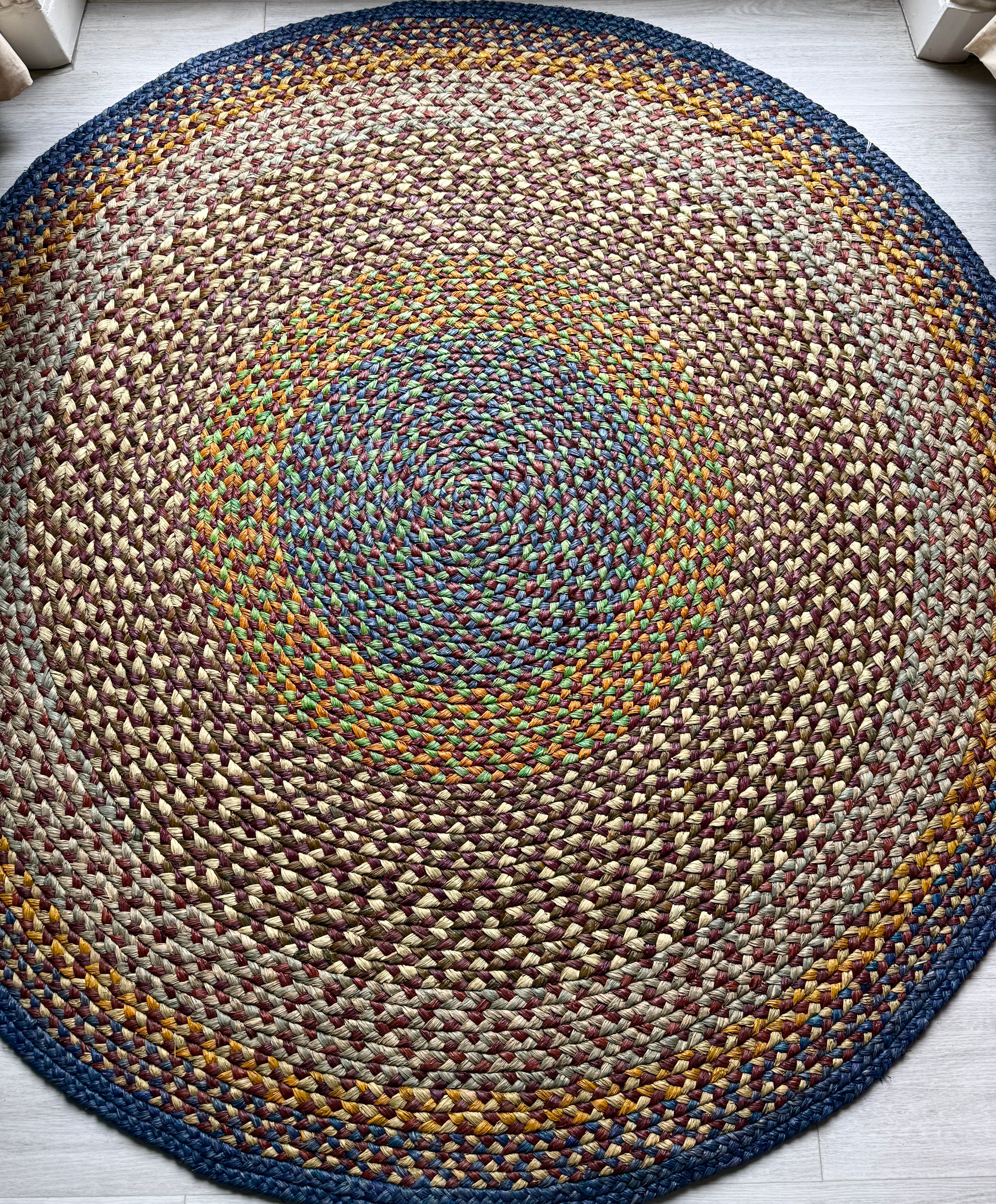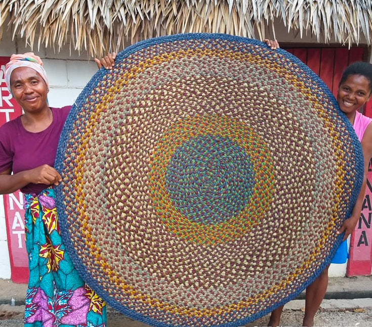 Round rug, 200 cm in diameter, made of raffia, hand-woven by Julienne from the Rouge Beauté association. A model with wide bands of gray raffia alternating with yellow raffia and different shades of blue. Each rug is unique! Each craftswoman imagines her rug and the colors that will compose it. She herself makes the shade of the raffia. Once the raffia is dry, she creates a long braid, which she continues by adding strands of raffia and winding this braid on itself as she goes. That's why rugs are round. It takes about 3 weeks to make a 2-meter diameter carpet.