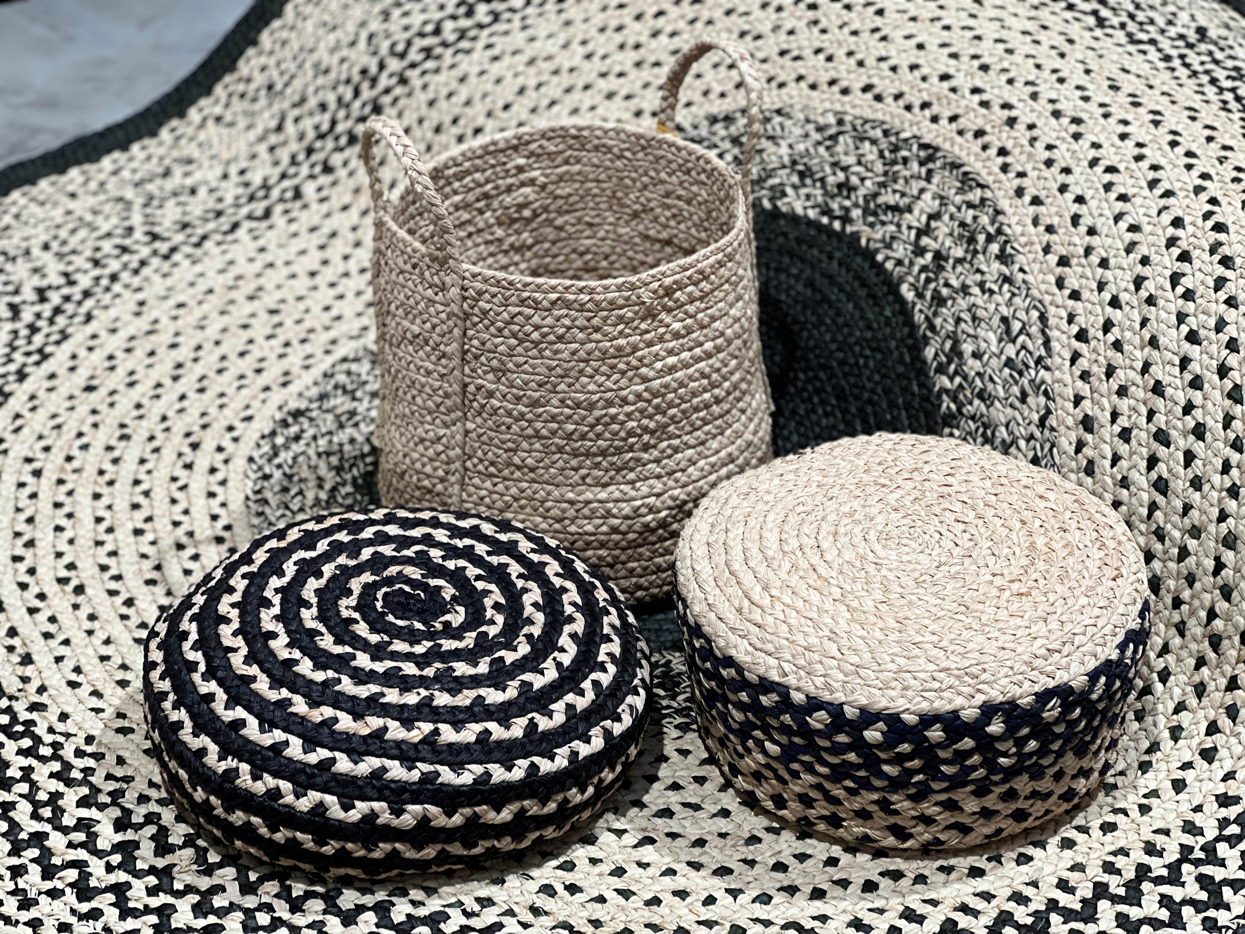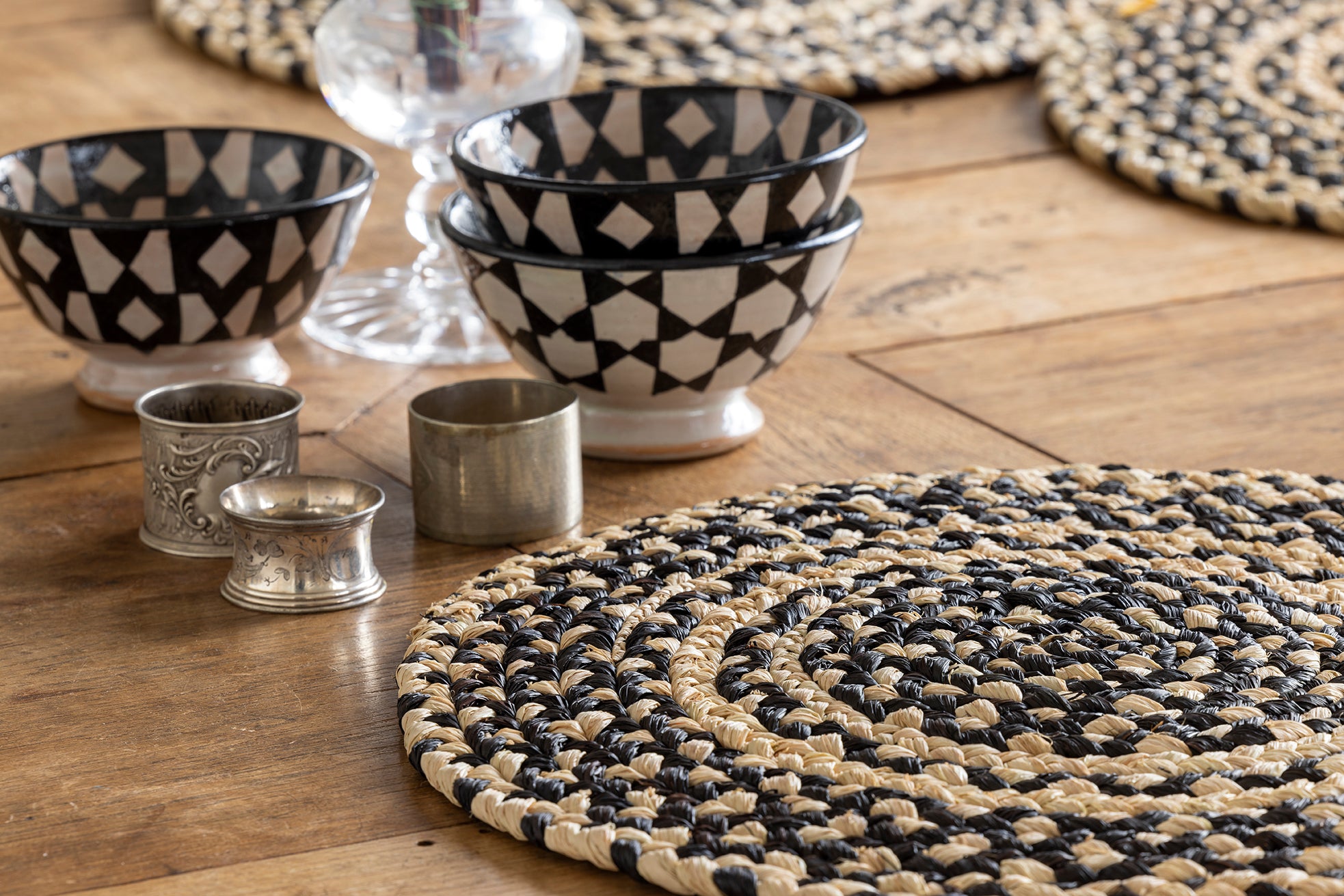 Round rug, 200 cm in diameter, made of raffia, hand-woven by Mélanie from the Rouge Beauté association in Madagascar. A contrasting model that vibrates black and white with a spiral of natural and black raffia. A strong and easy-to-live-with piece. Each rug is unique! Each craftswoman imagines her rug and the colors that will compose it. She herself makes the shade of the raffia. Once the raffia is dry, she creates a long braid, which she continues by adding strands of raffia and wrapping this braid on itself as she goes along. This is why the rugs are round. It takes almost 3 weeks to make a rug 2 meters in diameter.