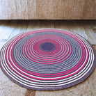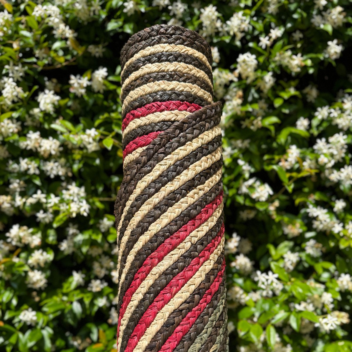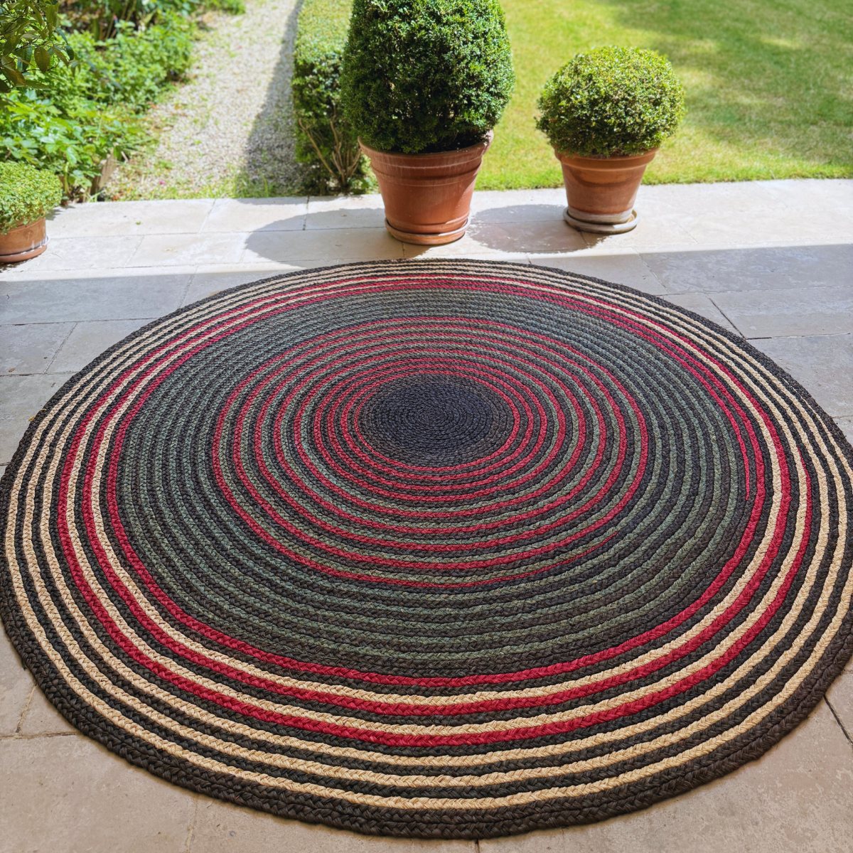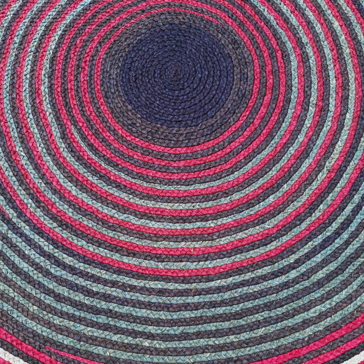 Round rug with a diameter of 200 cm in raffia, hand-woven by Fine from the Rouge Beauté association in Madagascar. A model where bright and luminous colors intertwine. Threads of yellow, blue, turquoise, emerald green mix to create a joyful, strong ensemble that boosts a colorful room. Each rug is unique! Each craftswoman imagines her rug and the colors that will compose it. She herself makes the shade of the raffia. Once the raffia is dry, she creates a long braid, which she continues by adding strands of raffia and wrapping this braid on itself as she goes along. This is why the rugs are round. It takes almost 3 weeks to make a rug 2 meters in diameter.