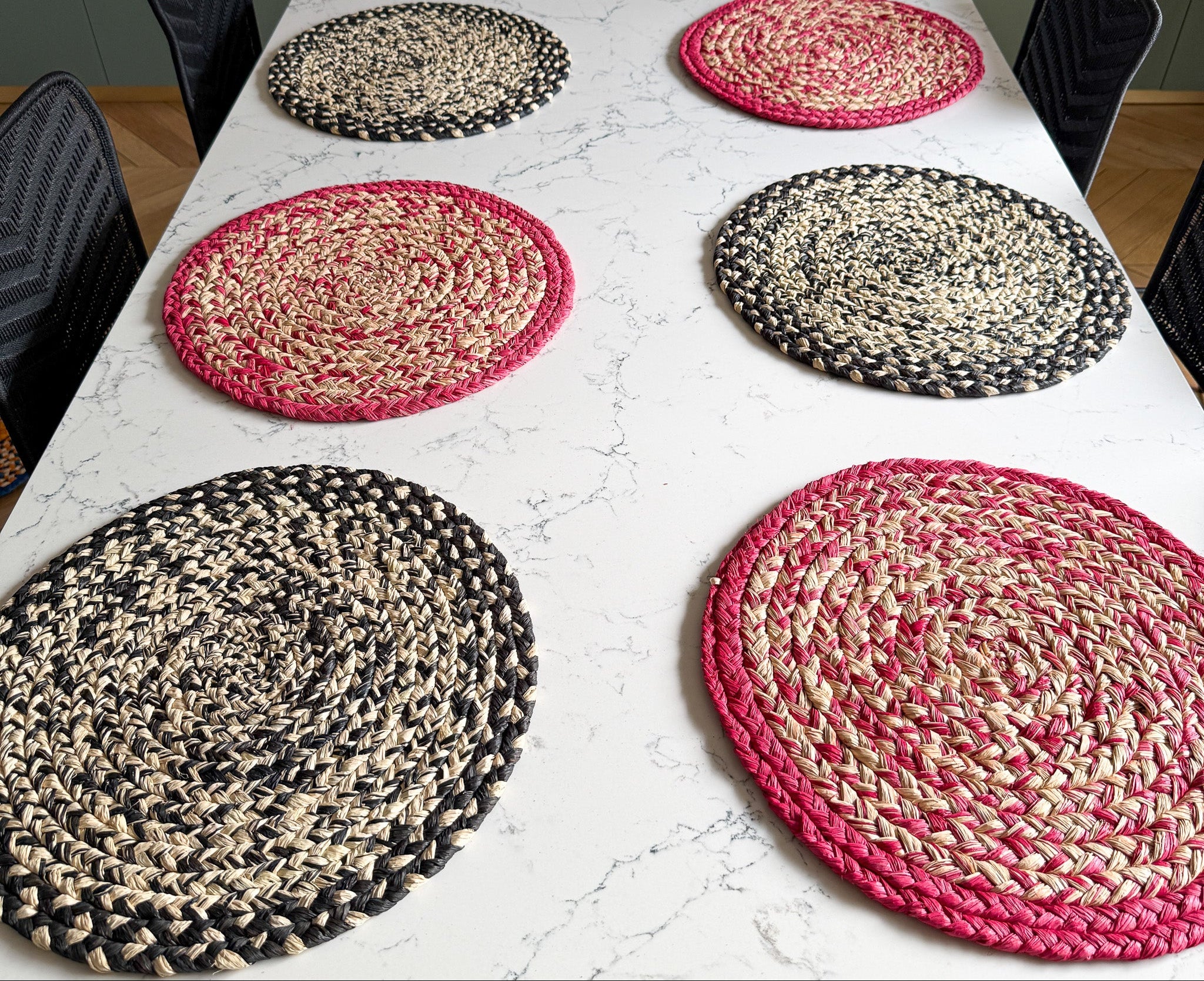 Set of 6 placemats in natural raffia, handmade by Elena. This set of 6 placemats is made of natural, bordered by a black line and a thicker border tinted with emerald green. Handmade in Madagascar, each set brings an artisanal touch to your table.