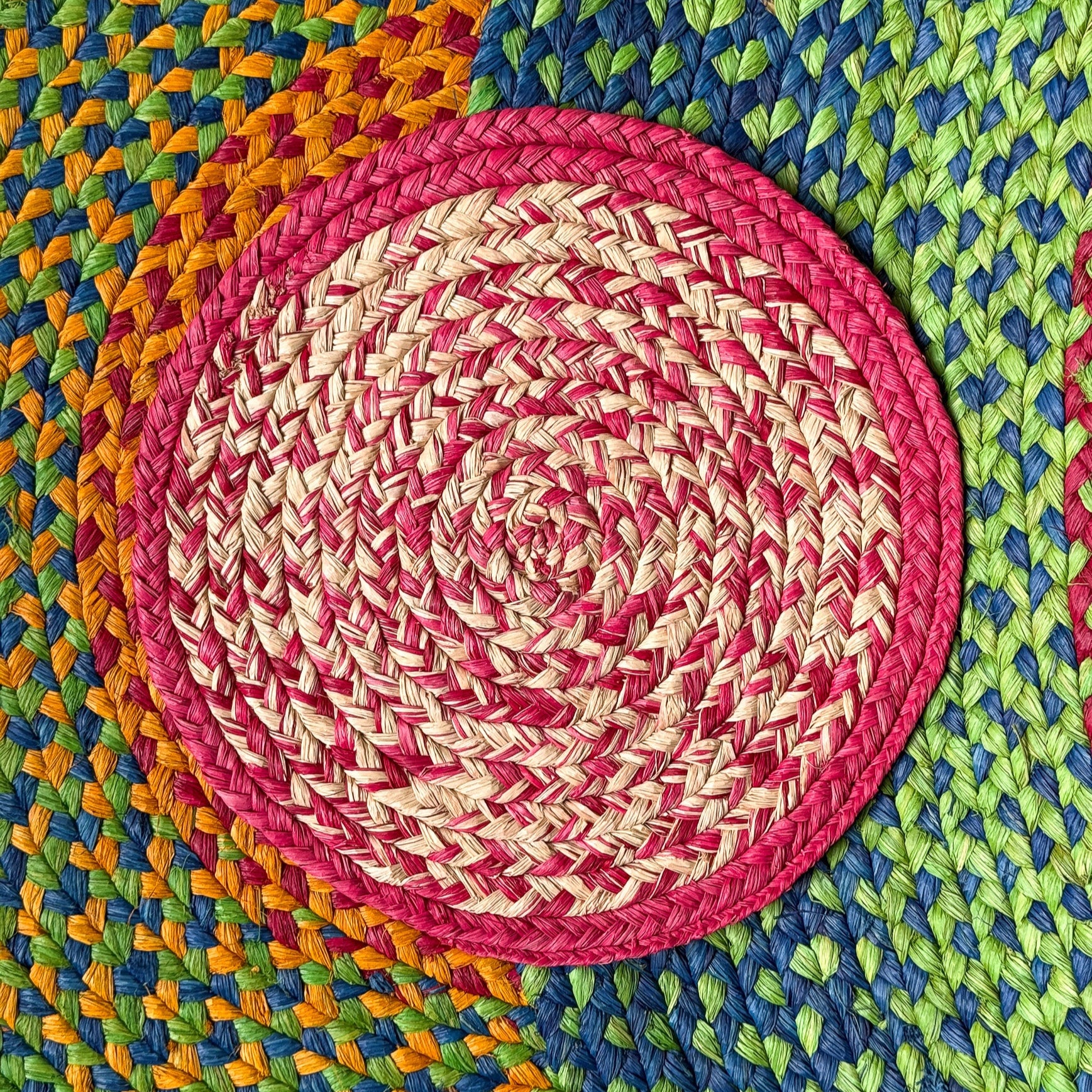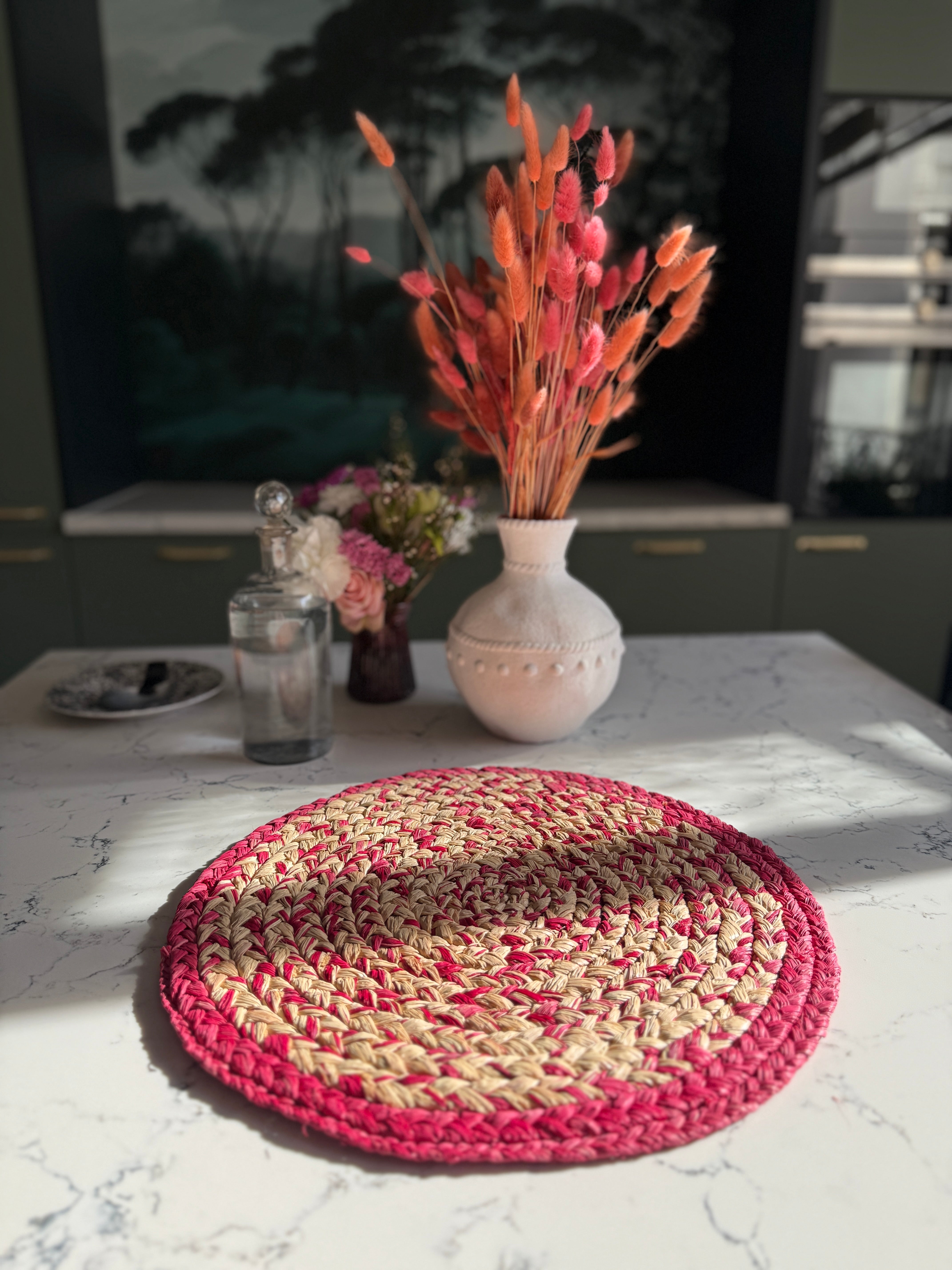 Set of 6 x round placemats in natural raffia with emerald green border - Elena