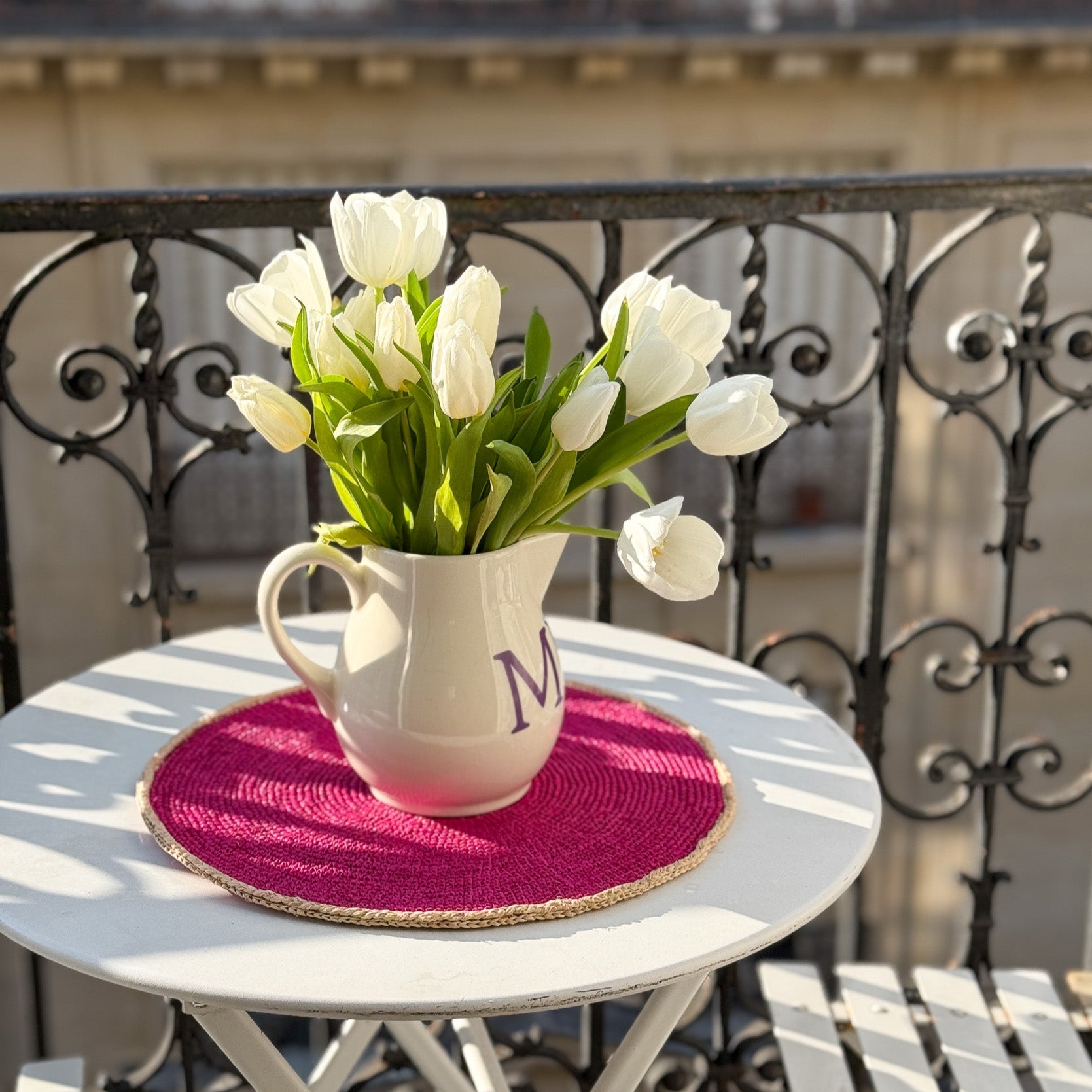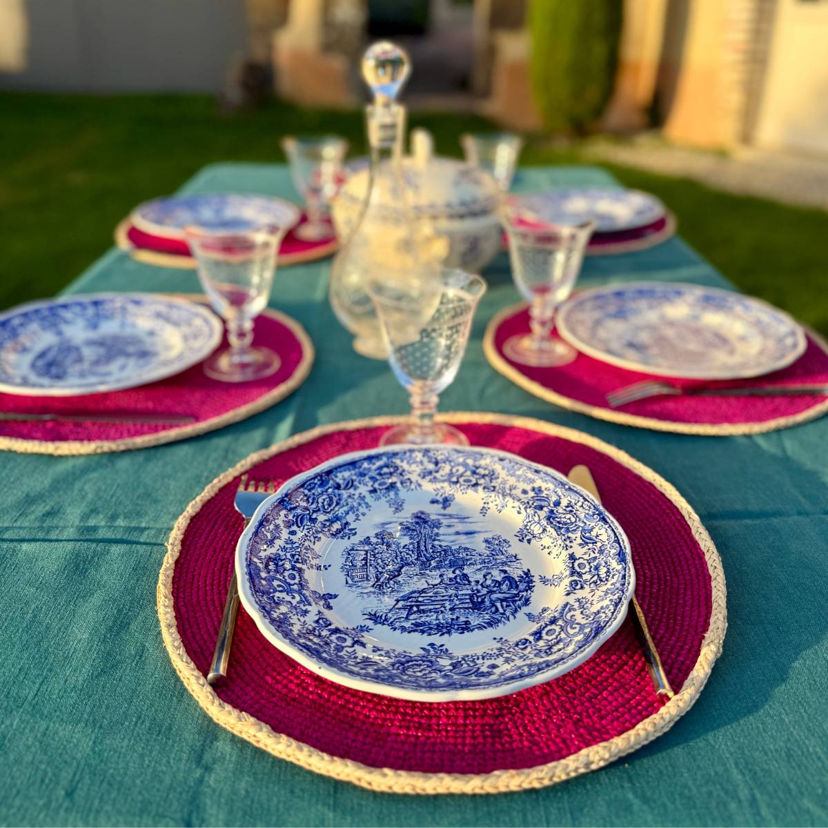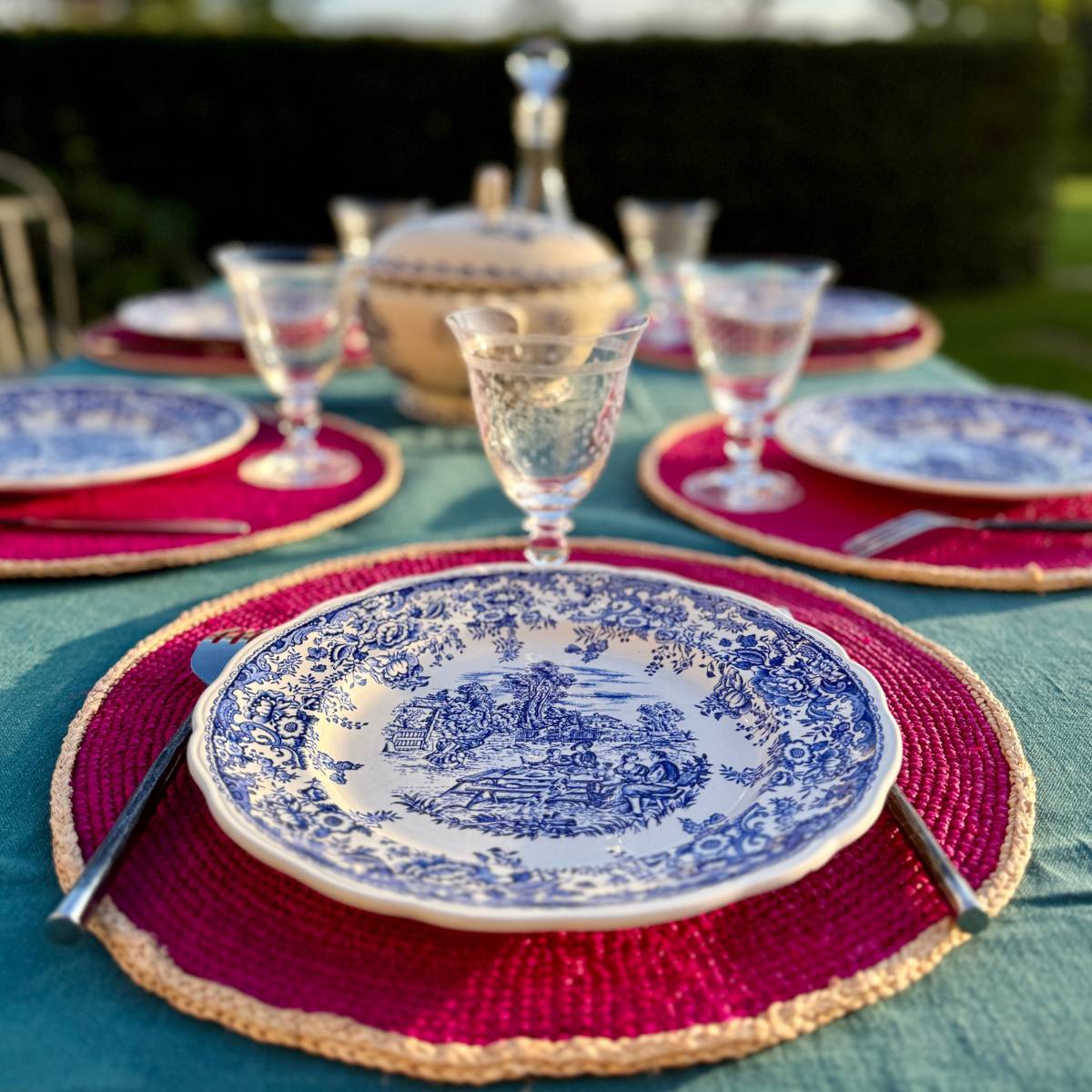 Set of 6 placemats in natural raffia, handmade by Tsiahivana. This set of 6 placemats is made of pink raffia, surrounded by a blue border. Handmade in Madagascar, each set brings an artisanal touch to your table.