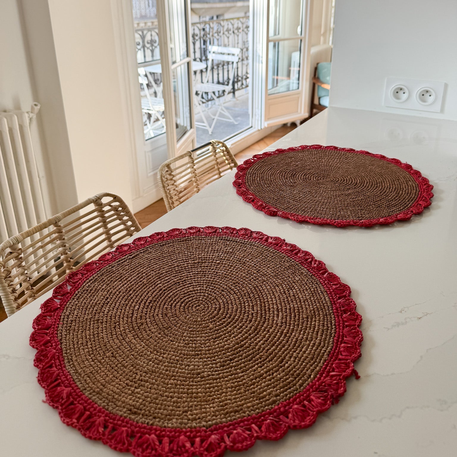 Set of 6 placemats in "tea" smoke-dyed raffia, hand-crocheted by Koloina, with a border in black colored scales. Handmade in Madagascar, each set brings an artisanal touch to your table.