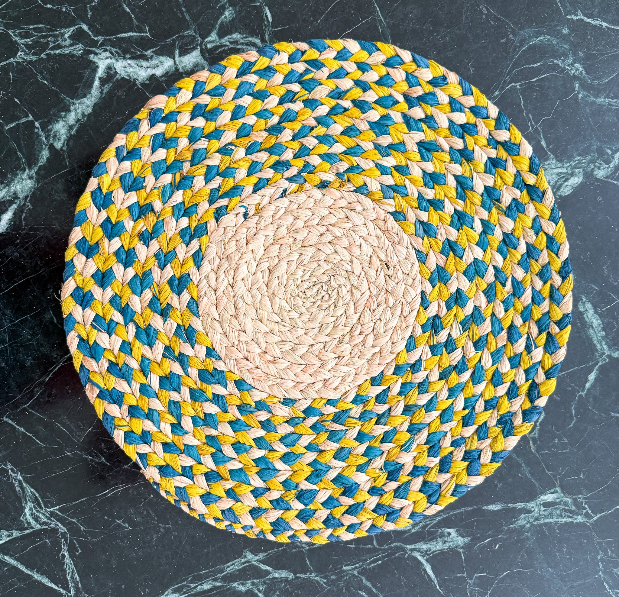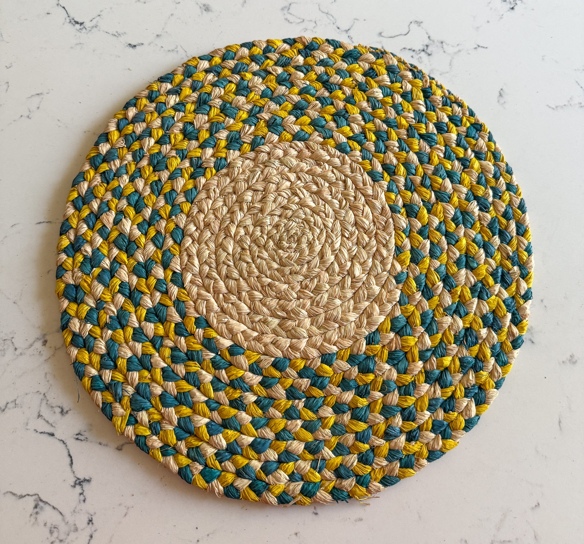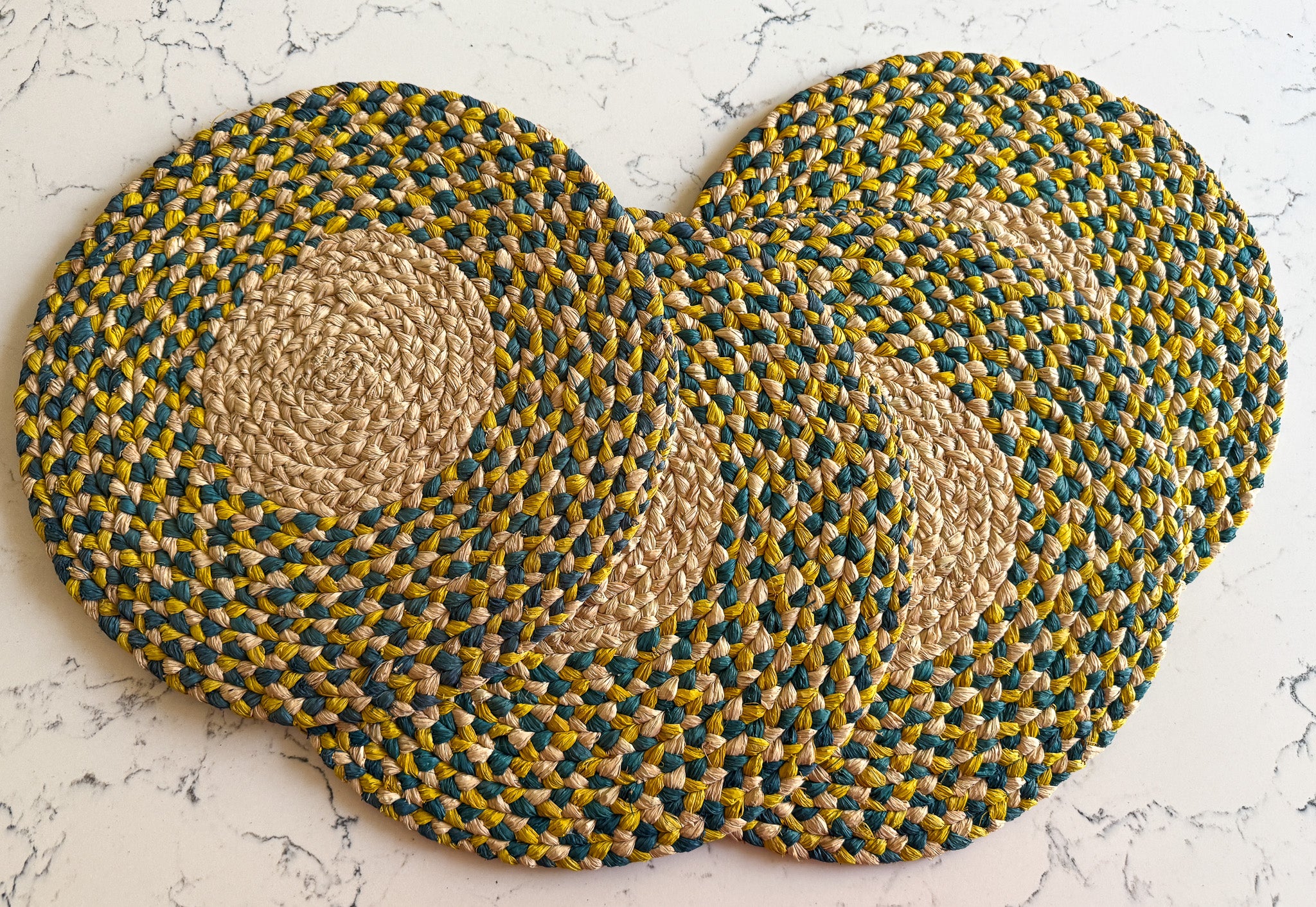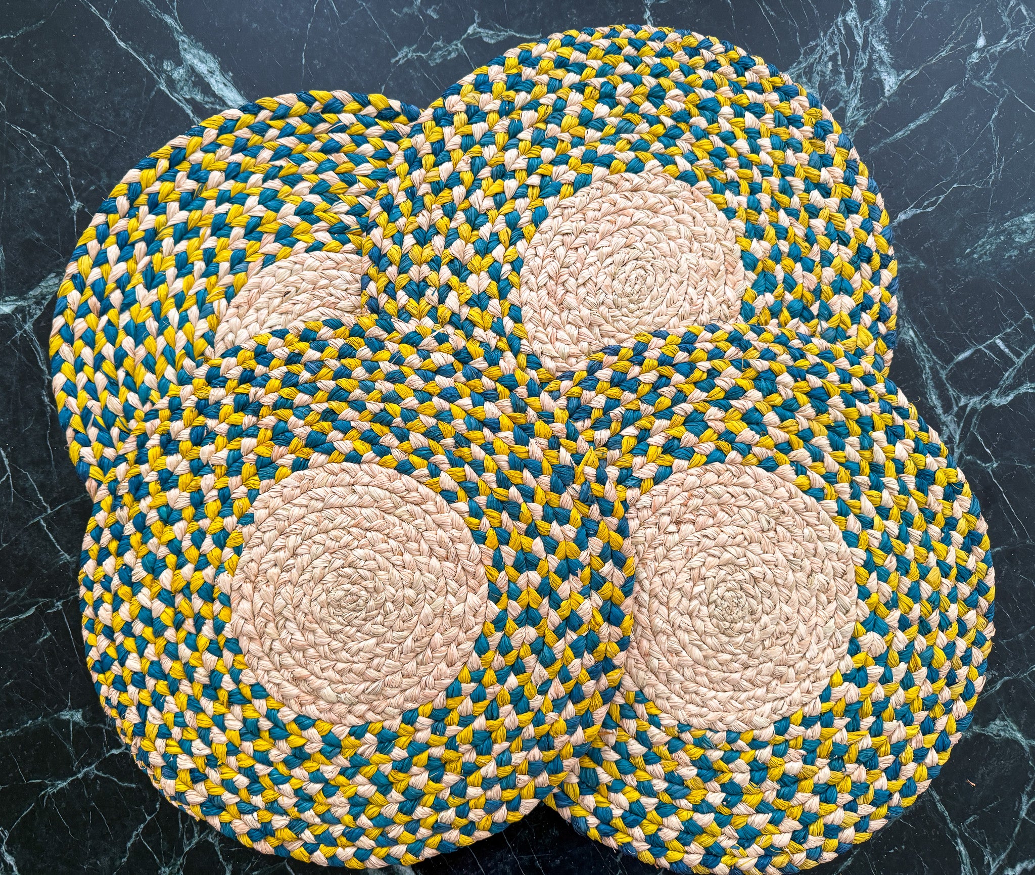 Set of 6 x round placemats in natural raffia with emerald green border - Elena