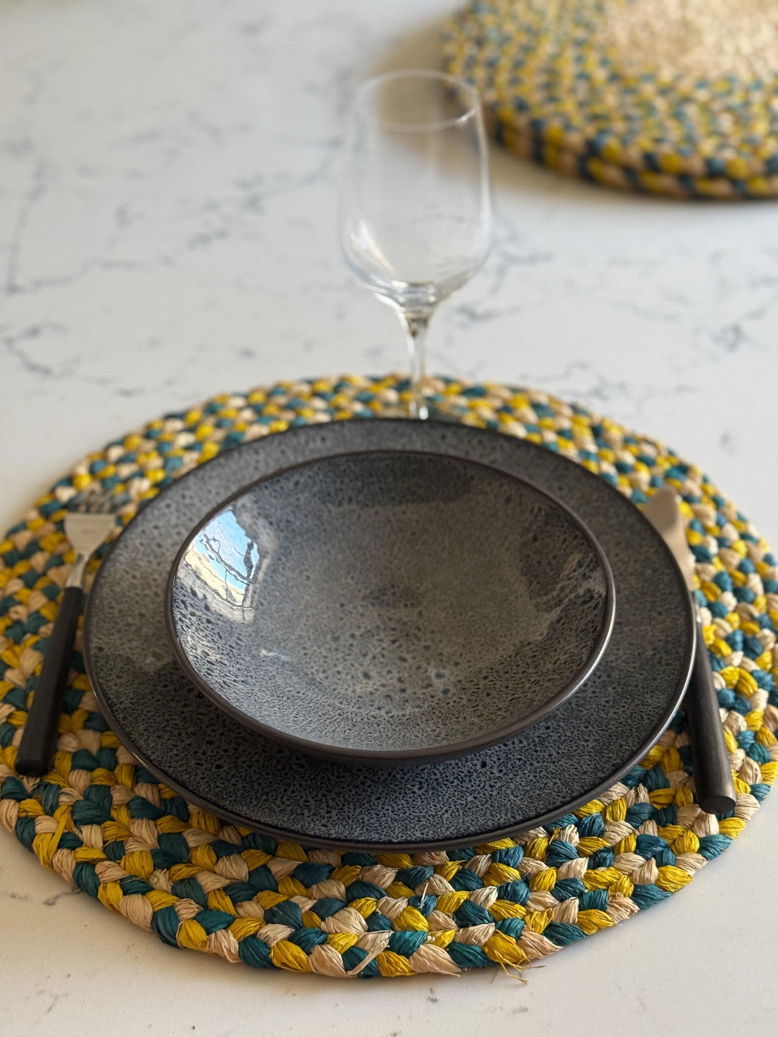 Set of 6 placemats in natural raffia, handmade by Elena. This set of 6 placemats is made of natural, bordered by a black line and a thicker border tinted with emerald green. Handmade in Madagascar, each set brings an artisanal touch to your table.