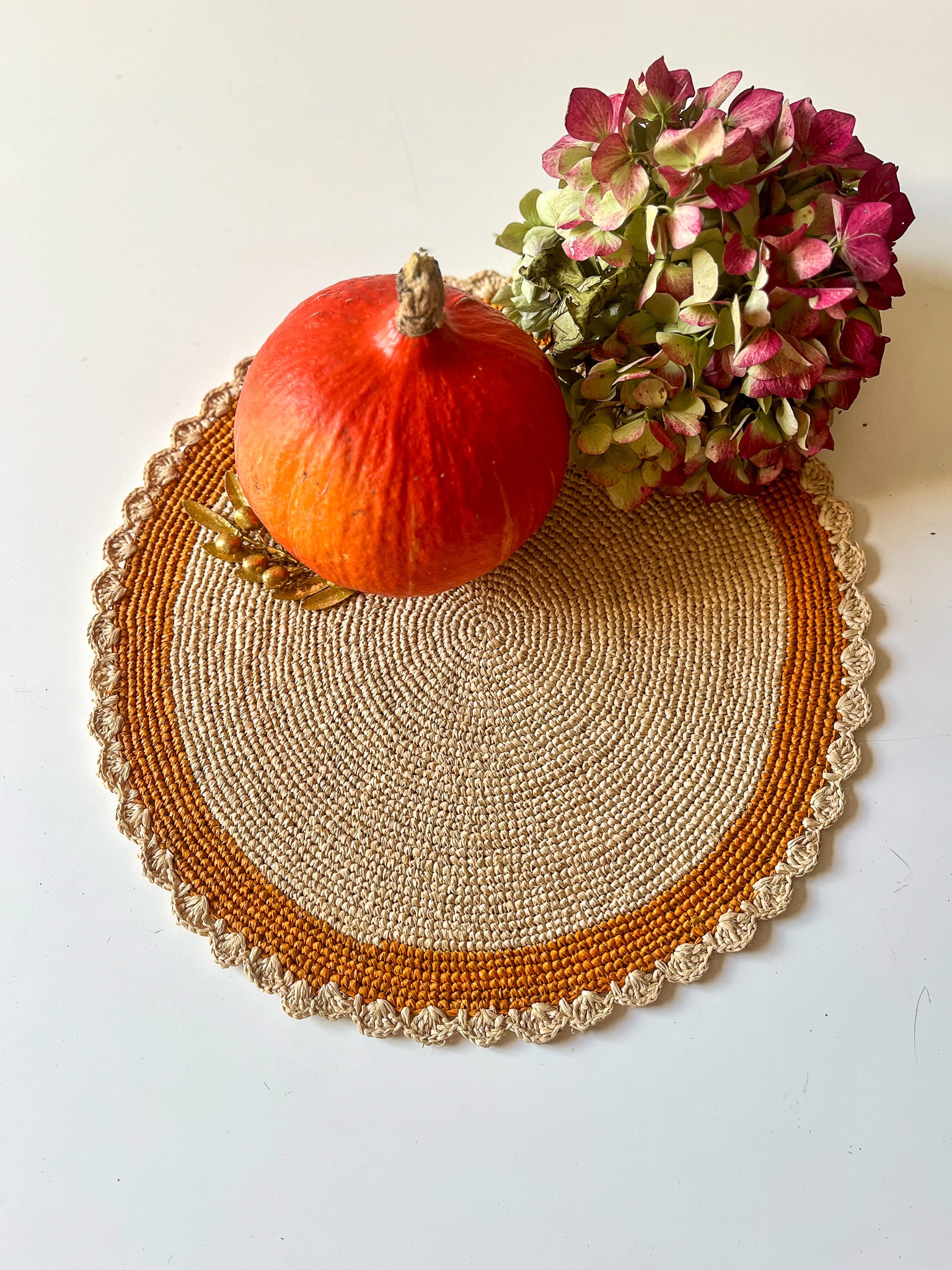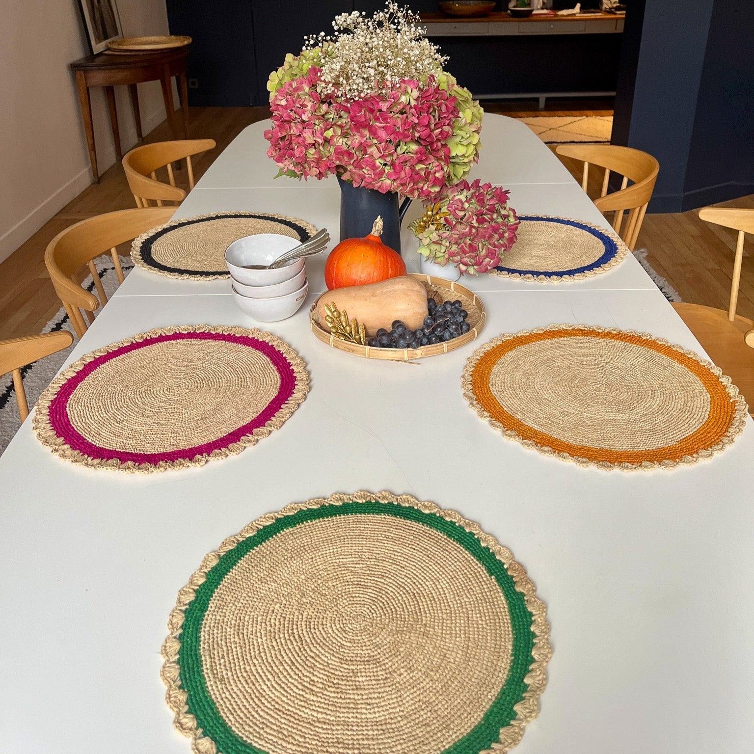 Raffia placemats handmade by Faniry. Made of natural raffia, it is edged in saffron yellow and surrounded by a scale raffia pattern. Handmade in Madagascar, each set brings an artisanal touch to your table.