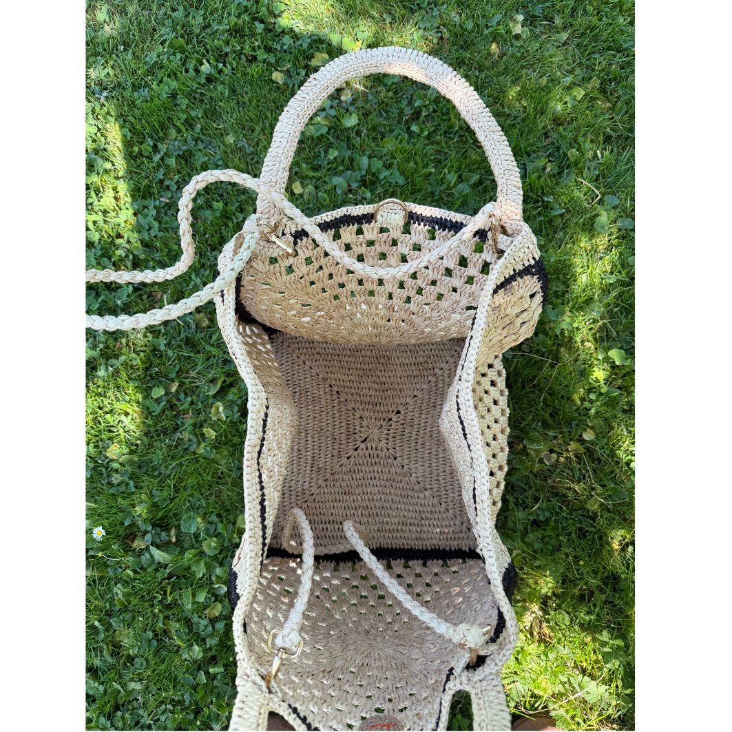 Raffia fanny pack, with gold zip, and adjustable and removable shoulder strap in lightly smoked “tea” and blue raffia. It is hand crocheted and assembled entirely by hand over 4 days in a workshop in Tananarive. The Mia fanny pack is the accessory of summer 2024! Practical and easy to live with, it supports a mobile life with style.