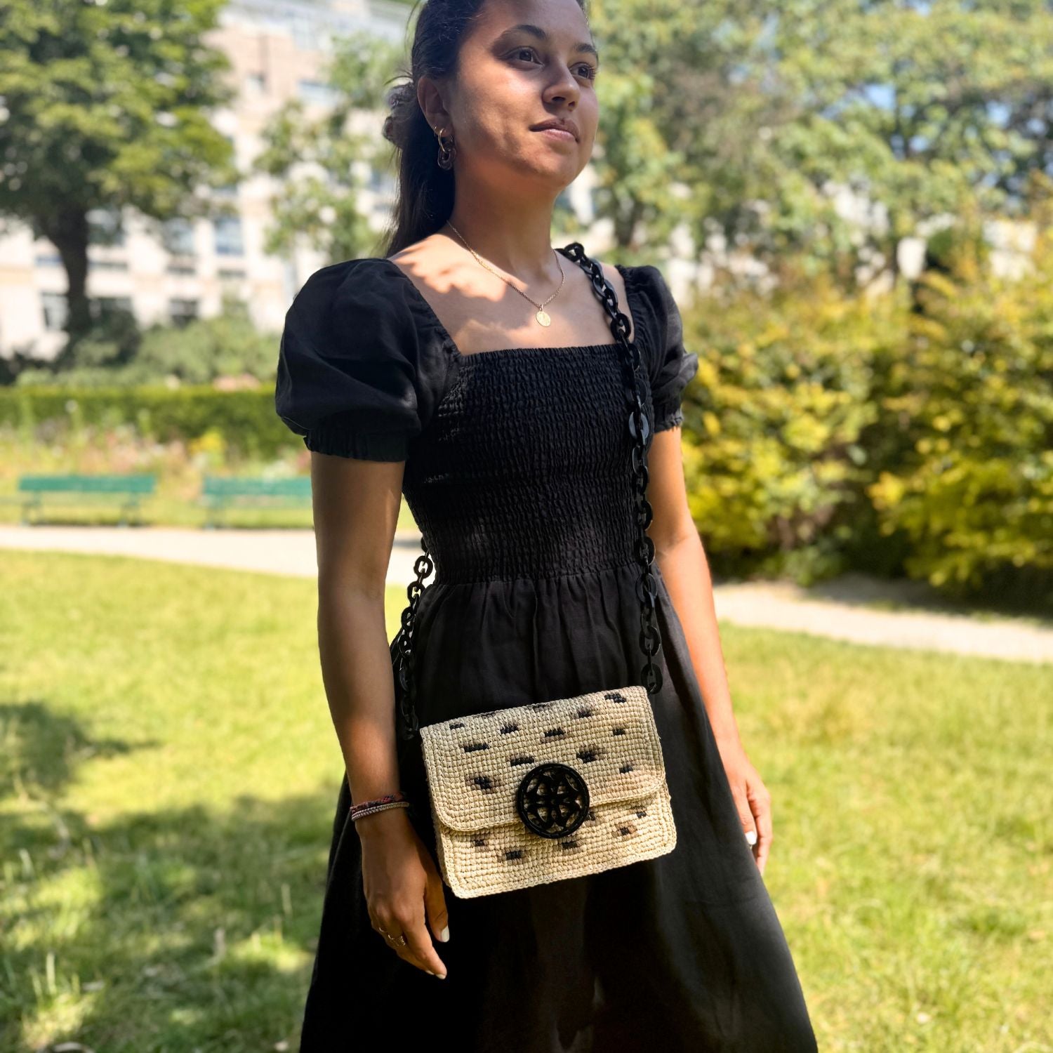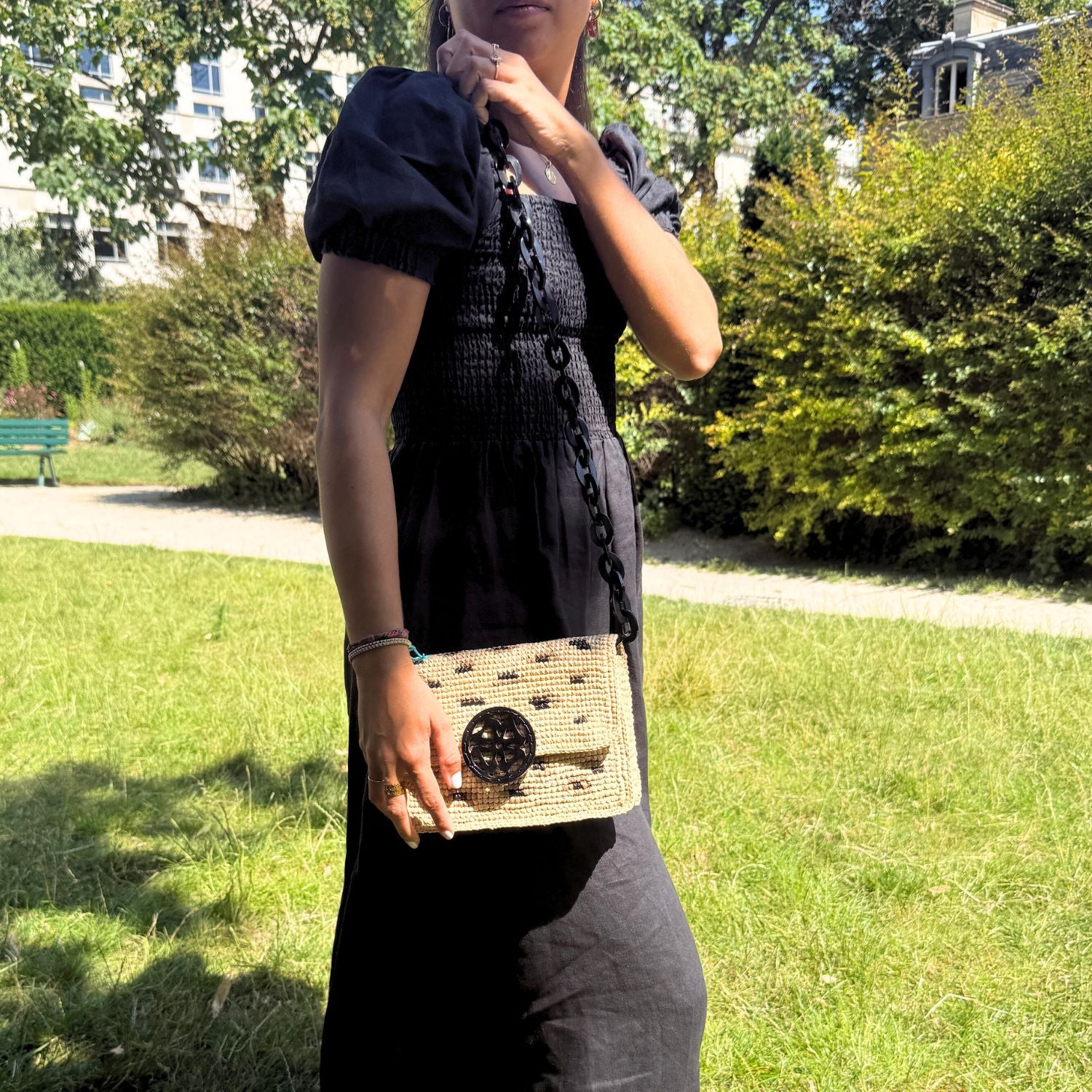 Raffia fanny pack, with gold zip, and adjustable and removable shoulder strap in lightly smoked “tea” and blue raffia. It is hand crocheted and assembled entirely by hand over 4 days in a workshop in Tananarive. The Mia fanny pack is the accessory of summer 2024! Practical and easy to live with, it supports a mobile life with style.