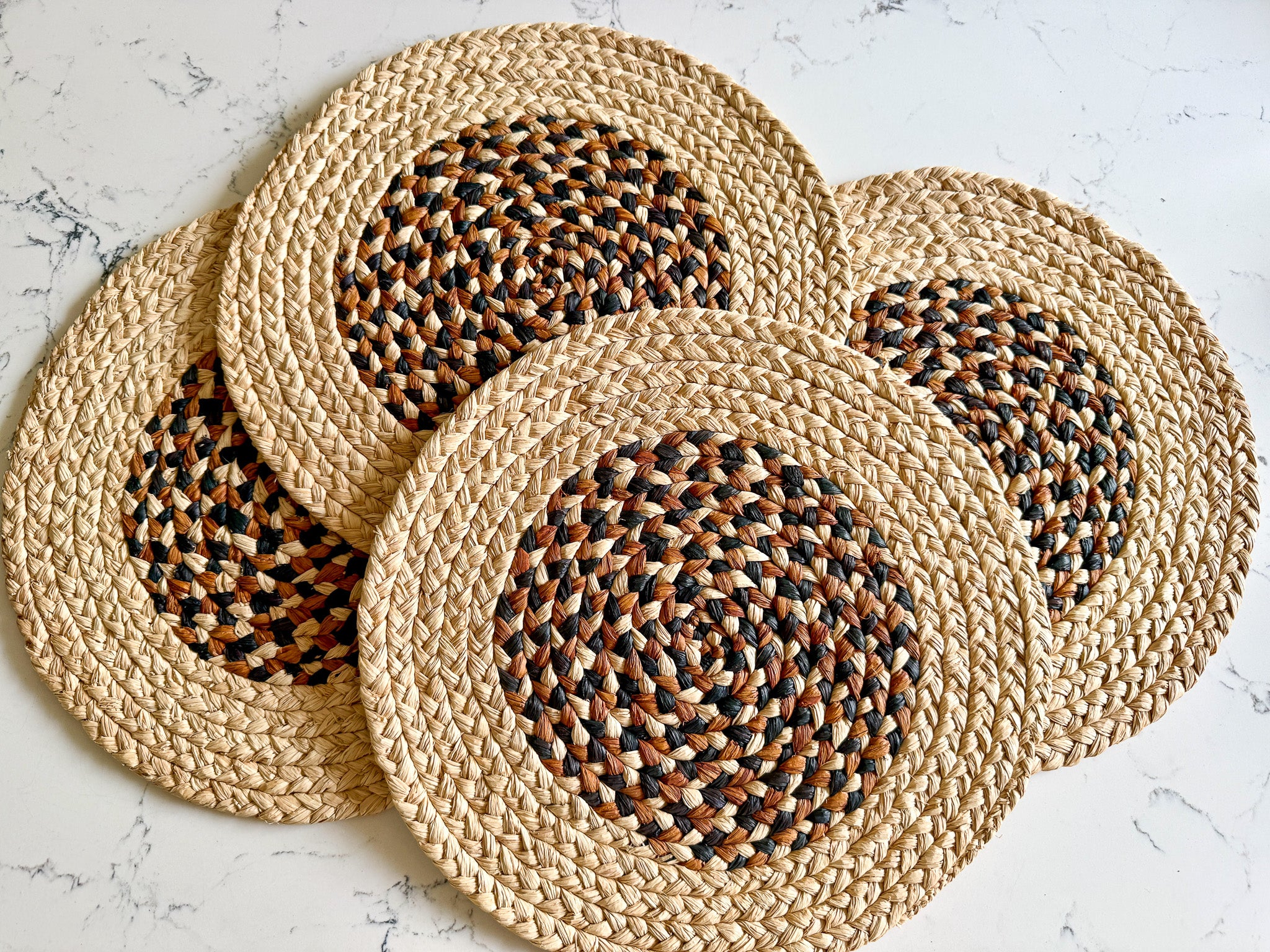 4 x sets de table épais en raphia tresse brune et ocre bordure naturelle