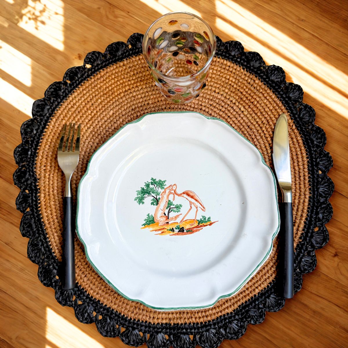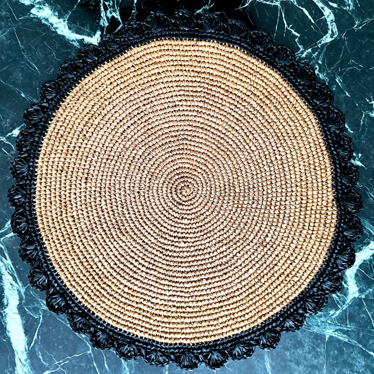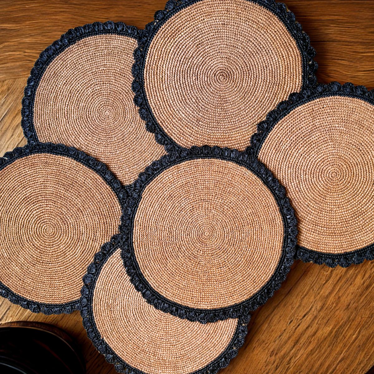 Sets de table en raphia teinter fumée "thé", crocheté à la main par Koloina, avec une bordure en écailles colorées de noir. Fait à la main à Madagascar, chaque ensemble apporte une touche artisanale à votre table.