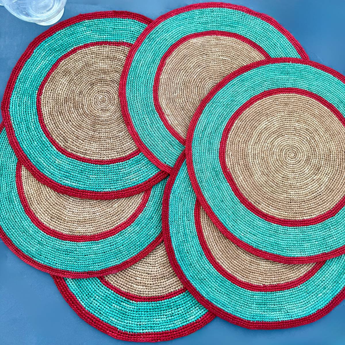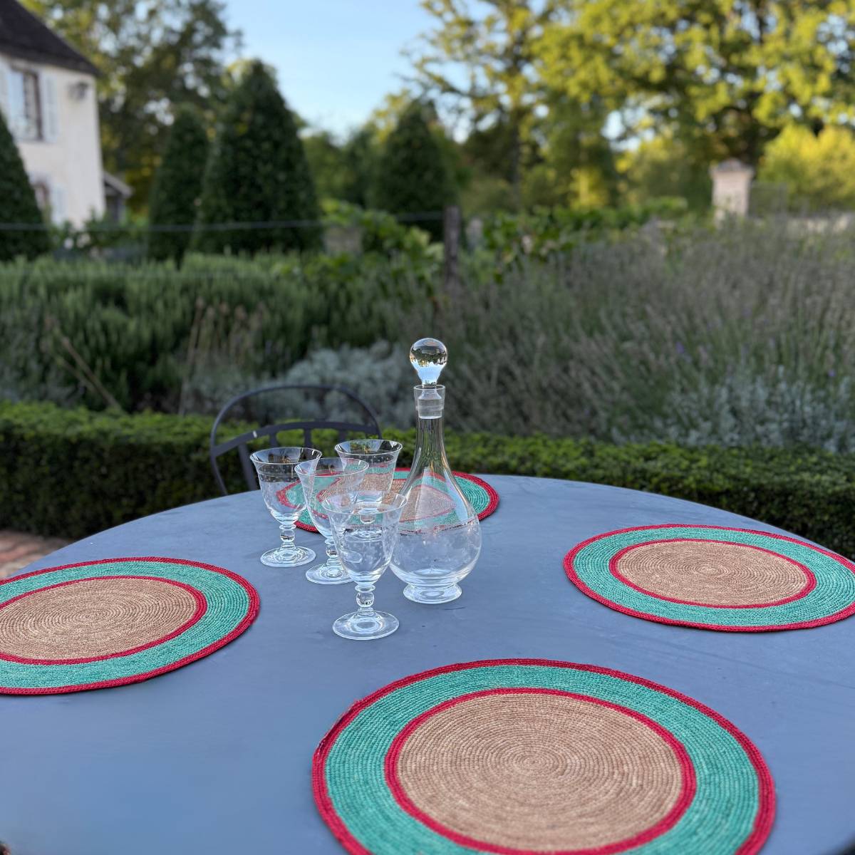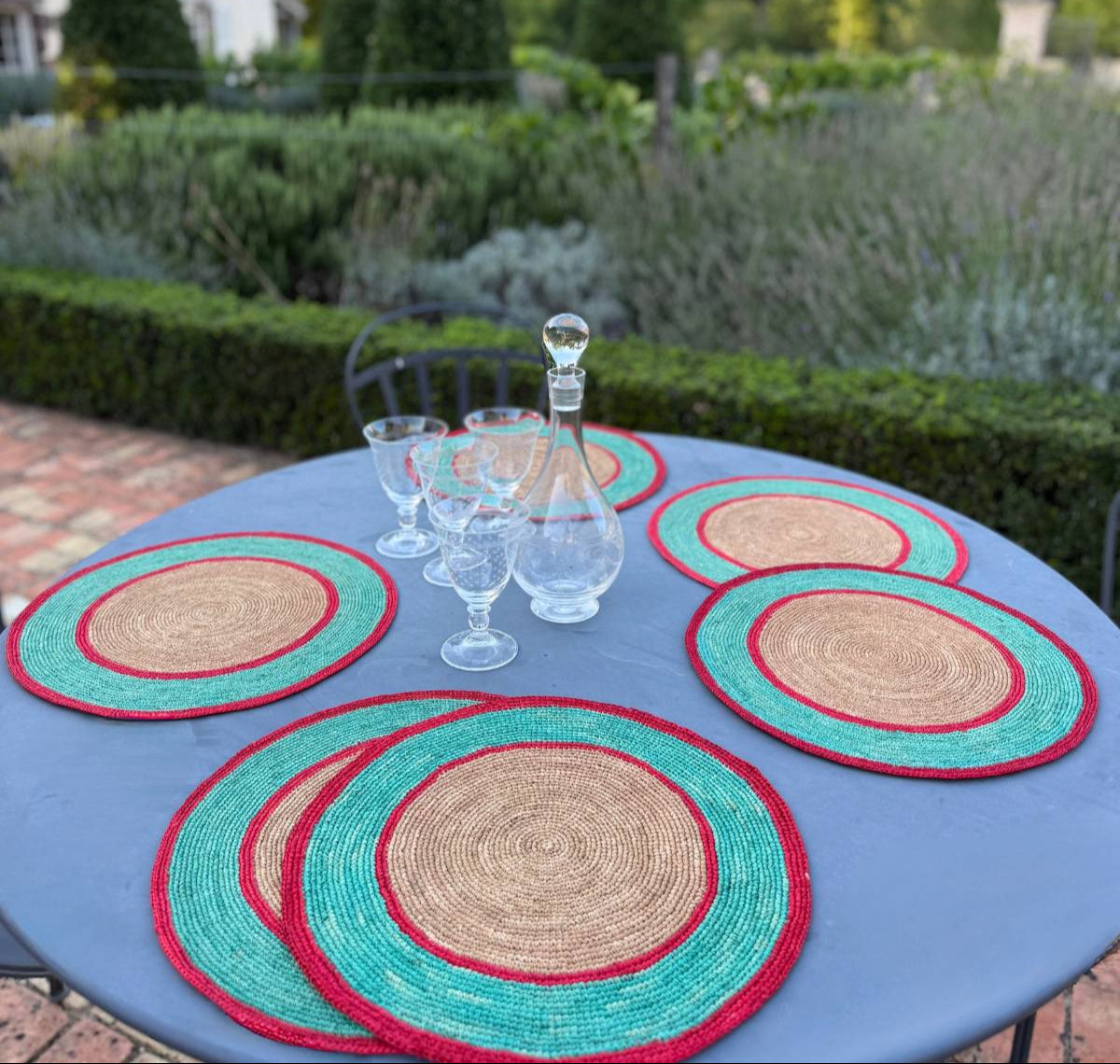 6 x sets de table ronds en raphia naturel bordure épaisse turquoise et fines lignes rouges