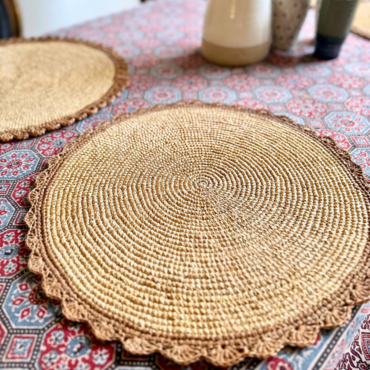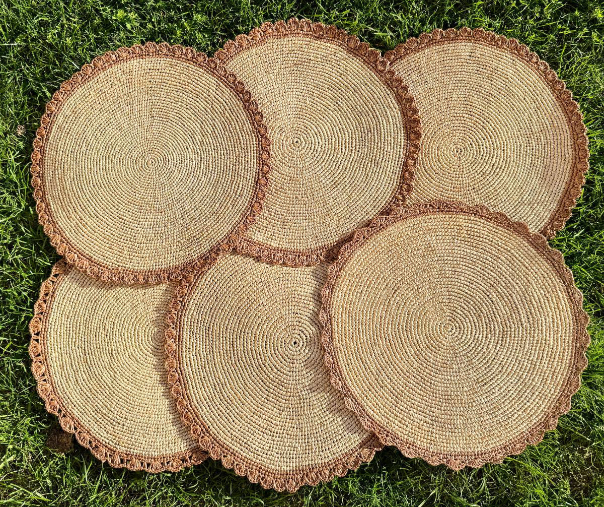 Sets de table ronds en raphia naturel bordés d'une ligne d'écailles effet dentelle en raphia beige caramel. Fais à la main à Tananarive, cet ensemble doux et naturel se marie avec des nappes à motifs pour leur donner une petite touche artisanale et vintage.