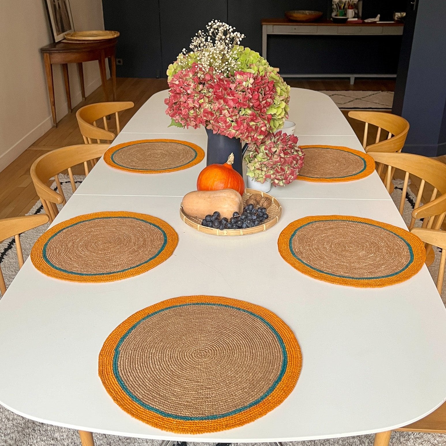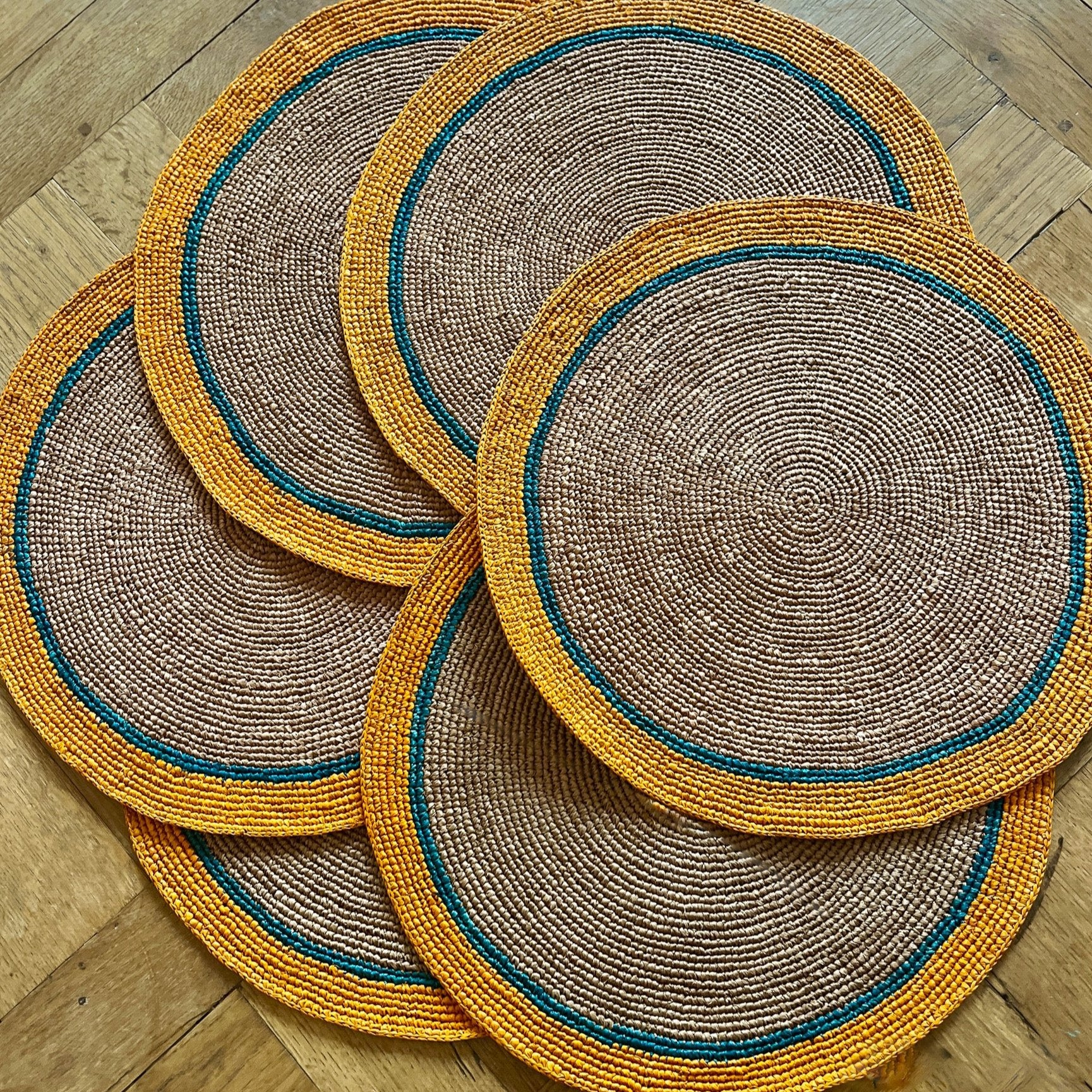 Lot de 6 x sets de table ronds en raphia thé bordure jaune