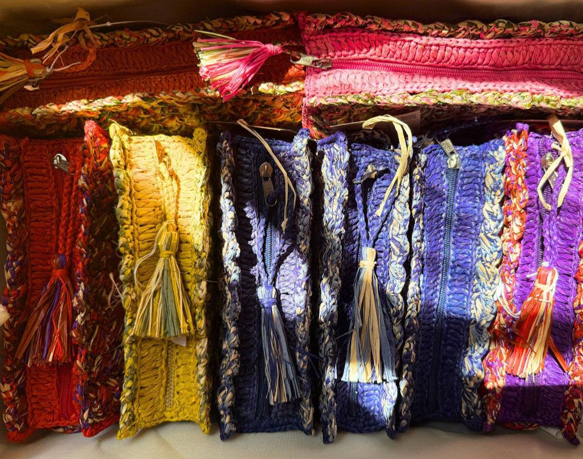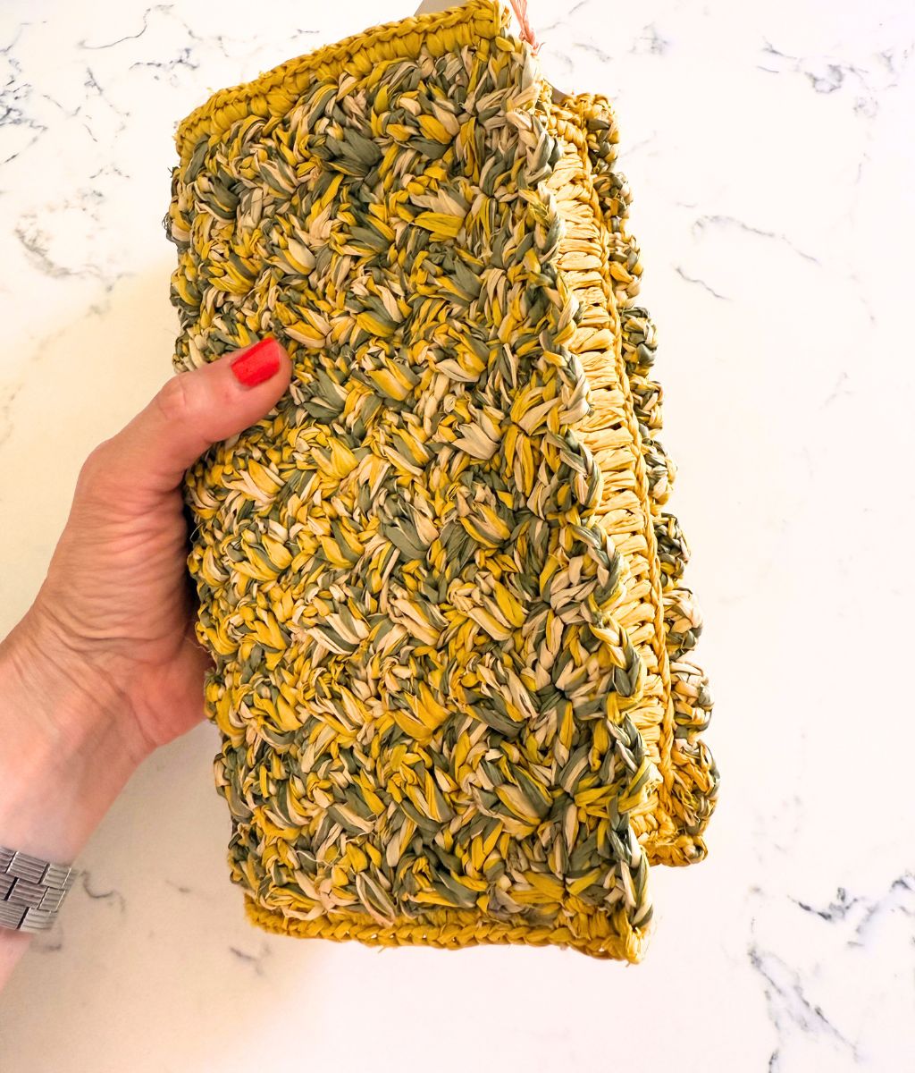 Pochette arrondie en raphia avec fermeture par un zip. Cette pochette est crochetée à la main avec des fils de raphia de couleurs jaune, vert et naturel pour un effet chiné. Format : 20 cm large x 13 cm hauteur