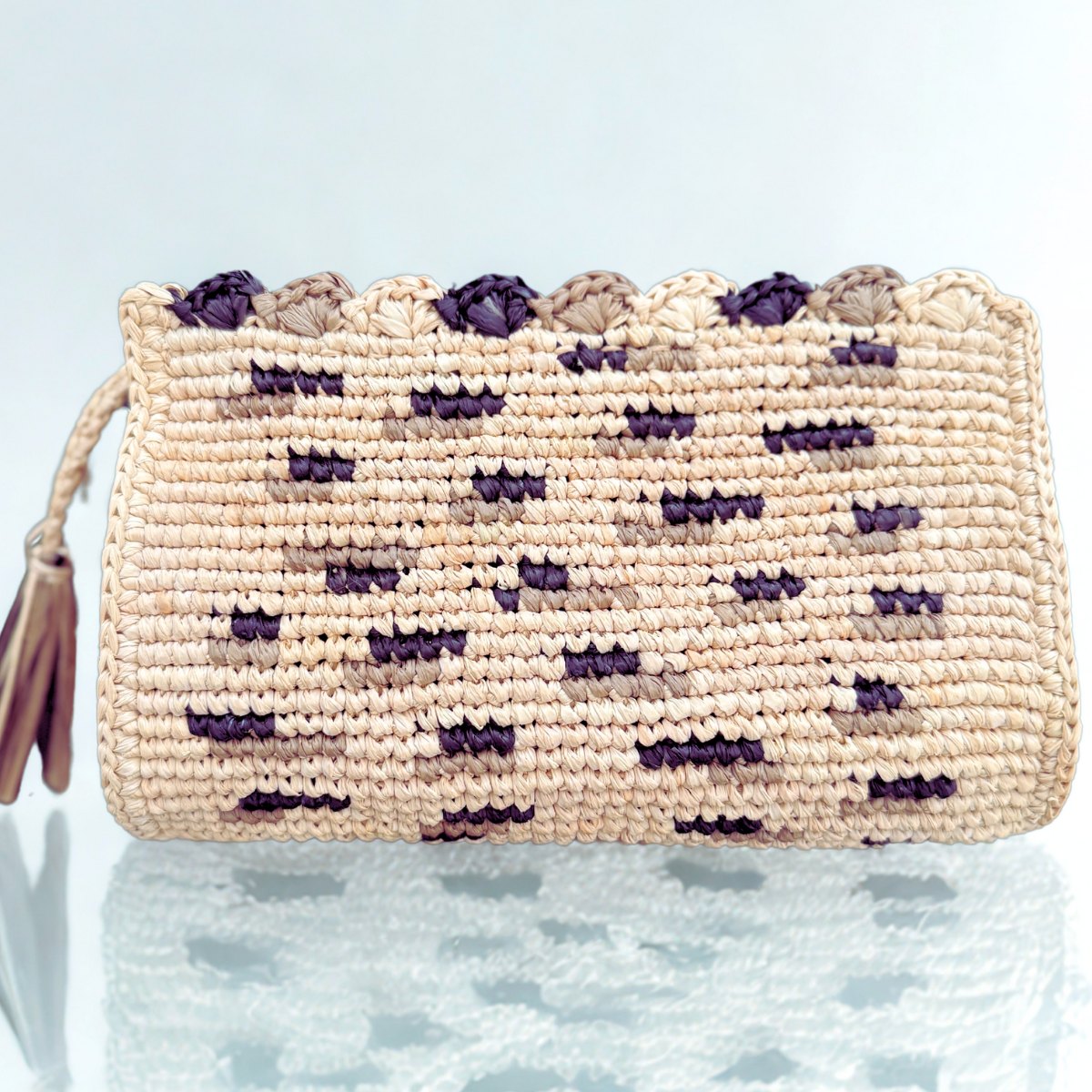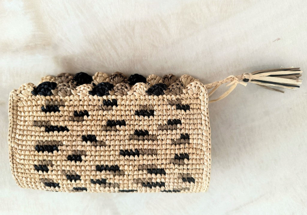 Pochette arrondie en raphia avec fermeture zippée ourlée d'écailles. Le point est en maille serrée sur une base de raphia naturel, avec un motif panthère. Format : 20 cm large x 13 cm hauteur