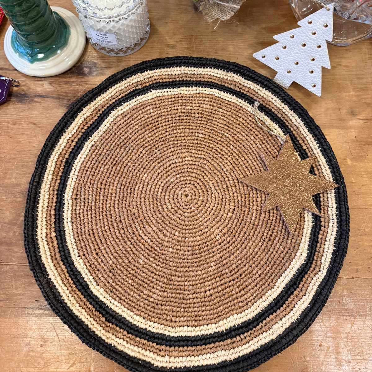Set de table rond en raphia thé avec des lignes écrues et marrons