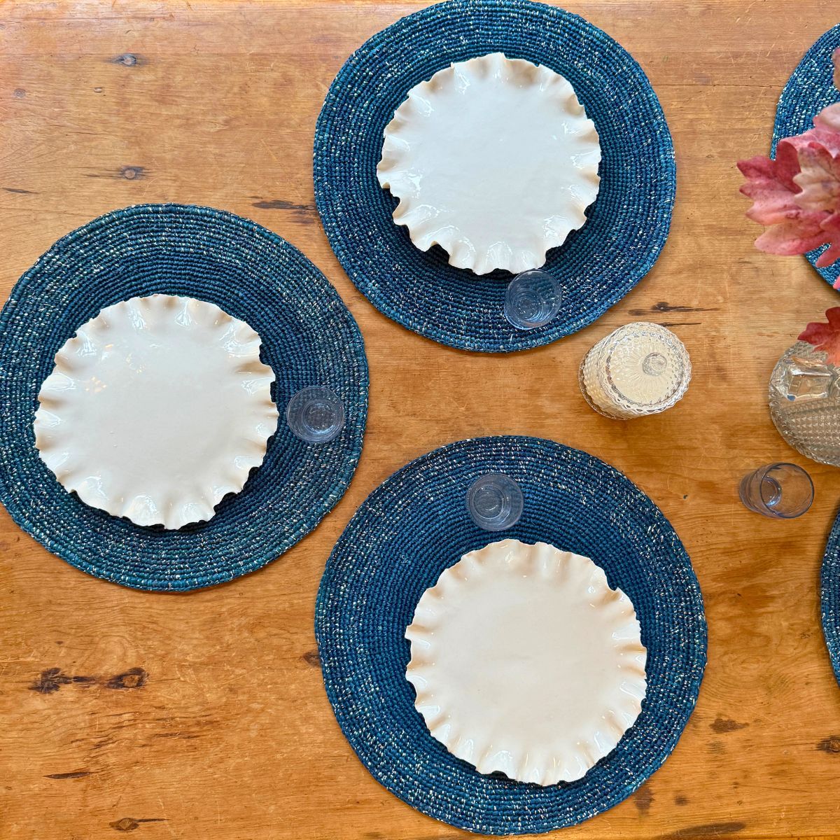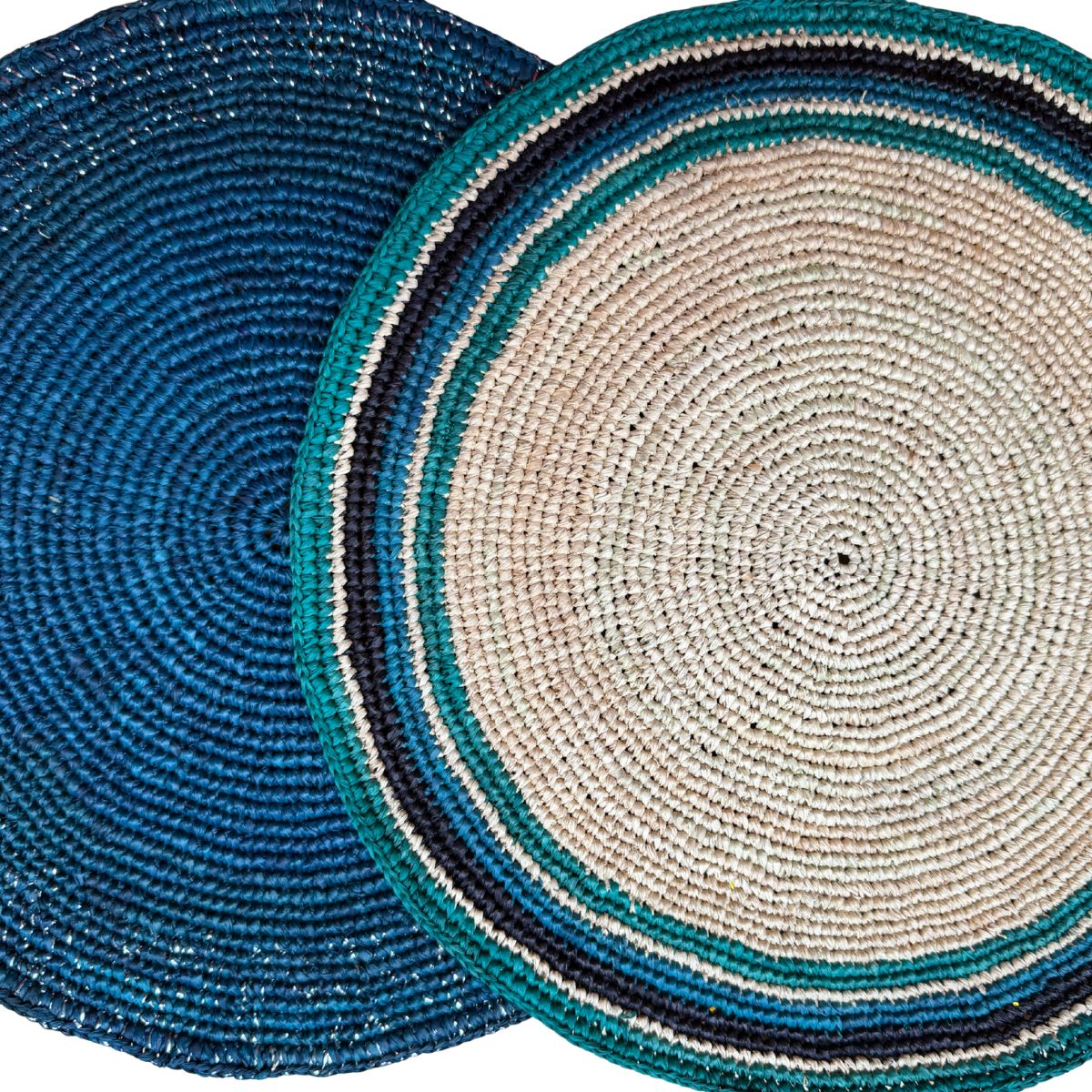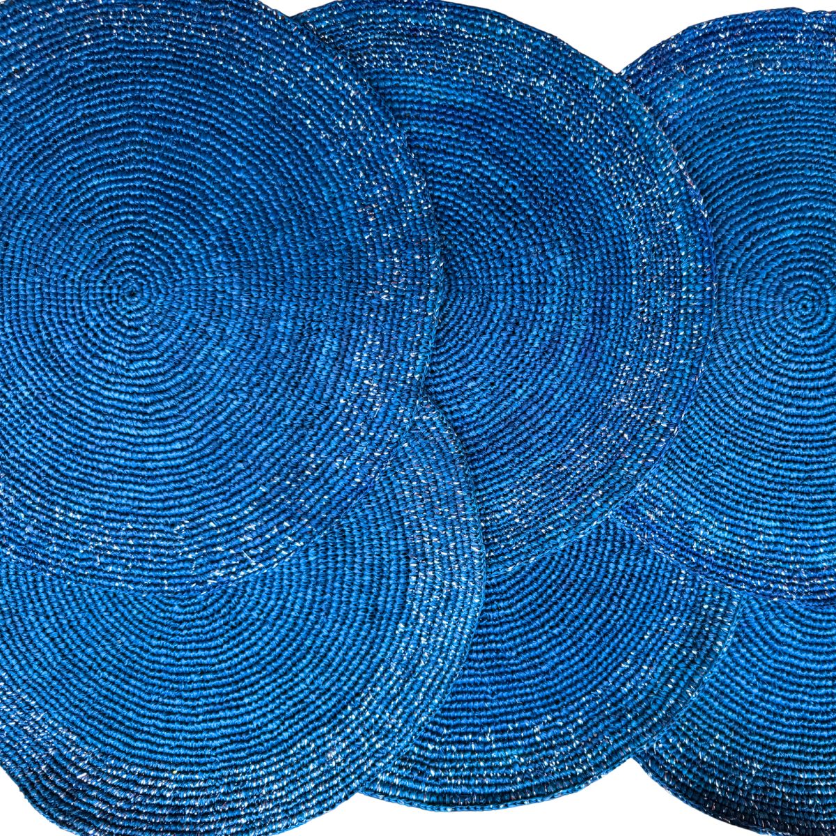 Sets de table fin en raphia bleu nuit avec une bordure en fil argenté. Faits à la main à Tananarive, ces sets de table donnent un style ethnique chic à une table, se marient aussi bien avec une nappe qu'une table en bois ou en pierre. Diamètre 37 cm.