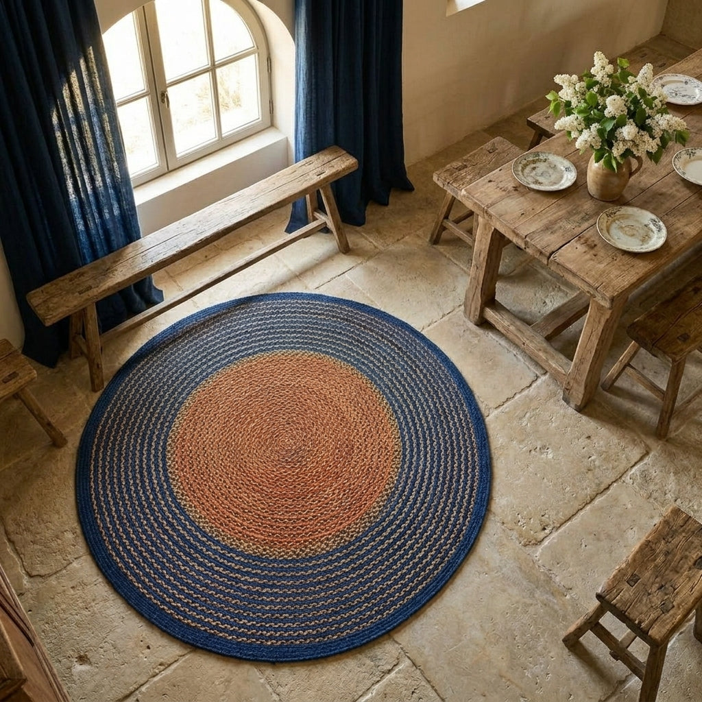 Tapis rond de diamètre 220 cm en raphia, tressé à la main par Soazy de l'association Rouge Beauté. Un modèle grand format en bleu indigo, idéal pour meubler une grande pièce. Chaque tapis est unique! Chaque artisane imagine son tapis et les couleurs qui le composeront. Elle réalise elle-même la teinte du raphia. Une fois le raphia séché, elle créé une longue tresse, qu’elle poursuit en ajoutant des brins de raphia et en enroulant cette tresse sur elle-même au fur et à mesure. C’est pourquoi les tapis sont ronds. Il faut plus de 3 semaines pour réaliser un tapis de 2,20 mètres de diamètre.