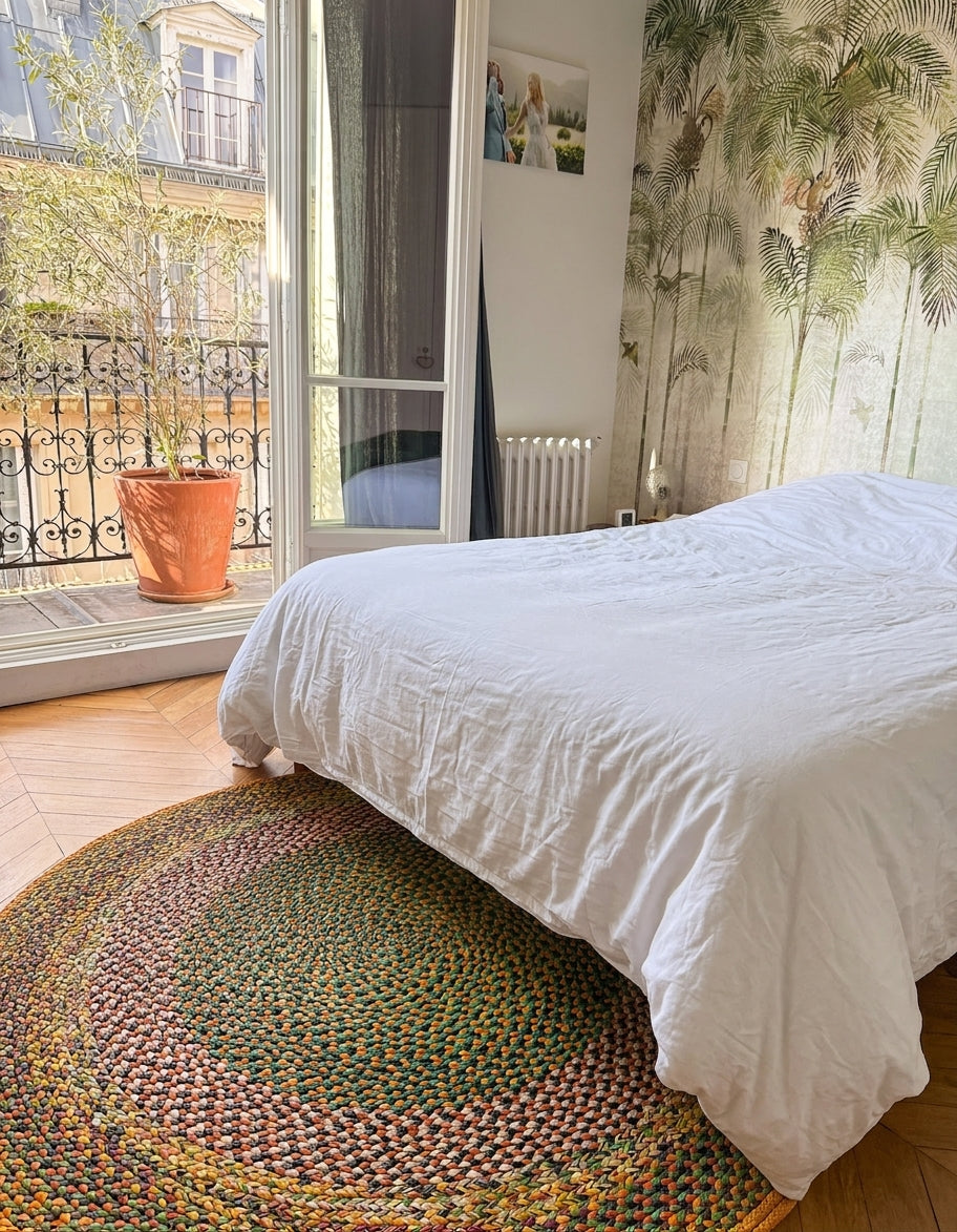 Tapis rond de diamètre 1,60 m en raphia, tressé à la main par Odette de l'association Rouge Beauté. Un modèle intense et décoratif, qui mêle des coloris rouge brique, terracotta, bleu et brun. Les artisanes créent leurs teintures pour le raphia et tressent chacune à leur manière, réalisant des motifs différents qui font ressortir les couleurs dans des harmonies inattendues. Elles forment une longue tresse avec le raphia, qu'elles complètent au fur et à mesure. Les tapis ainsi formés mesurent entre 60 cm et 230 cm de diamètre pour des résultats très variés. Ce sont des pièces uniques. Il faut compter 4 jours de fabrication pour un tapis de 1 m, et près de 3 semaines pour un tapis de 2 m de diamètre.