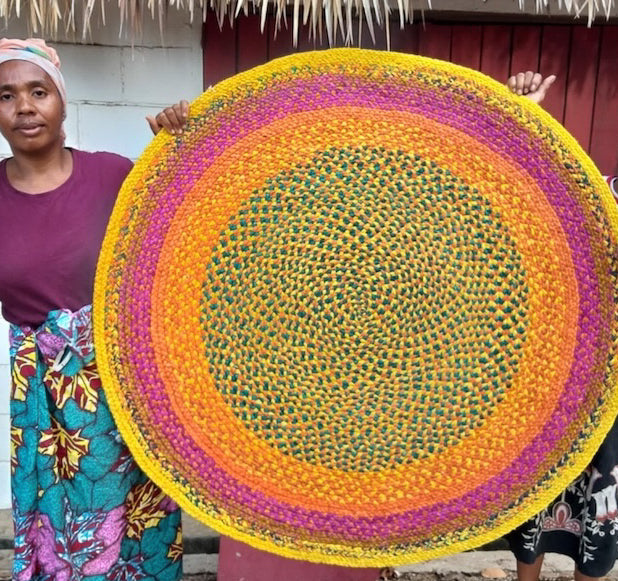Tapis rond de diamètre 1,20 m en raphia, tressé à la main par Angela de l'association Rouge Beauté. Un modèle doux et coloré en jaune, rose, parme et vert. Chaque tapis est unique! Les artisanes créent leurs teintures pour le raphia et tressent chacune à leur manière, réalisant des motifs différents qui font ressortir les couleurs dans des harmonies inattendues. Elles forment une longue tresse avec le raphia, qu'elles complètent au fur et à mesure. Les tapis ainsi formés mesurent entre 60 cm et 230 cm de diamètre pour des résultats très variés. Ce sont des pièces uniques. Il faut compter 4 jours de fabrication pour un tapis de 1 m, et près de 3 semaines pour un tapis de 2 m de diamètre.